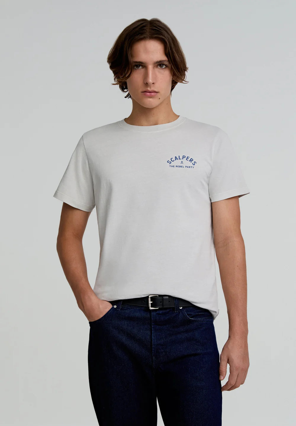 Camiseta desteñida 100 % algodón BCI. Corte regular, cuello redondo y manga corta. Estampado en la espalda y el pecho.