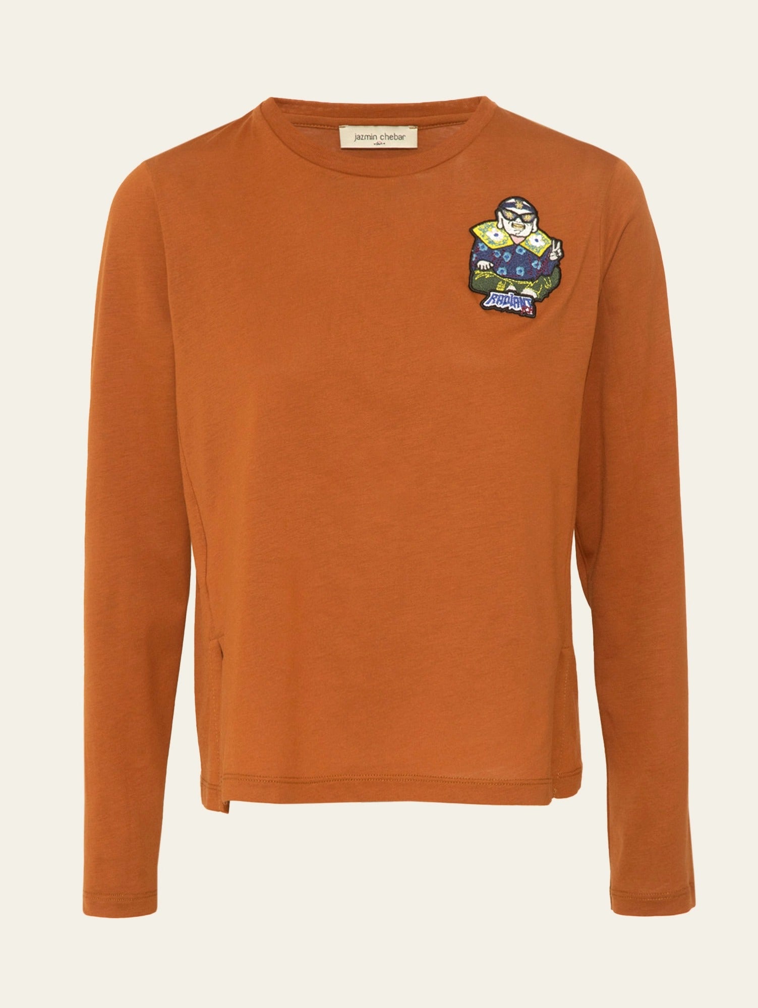 Camiseta confeccionada en algodón pima 100%. Fit clásico y holgado, con escote redondo tejido y mangas largas. Sobre los laterales tiene recortes que se funden hacia el delantero terminando en pequeños tajos. Incluye parche Buda bordado en el frente.