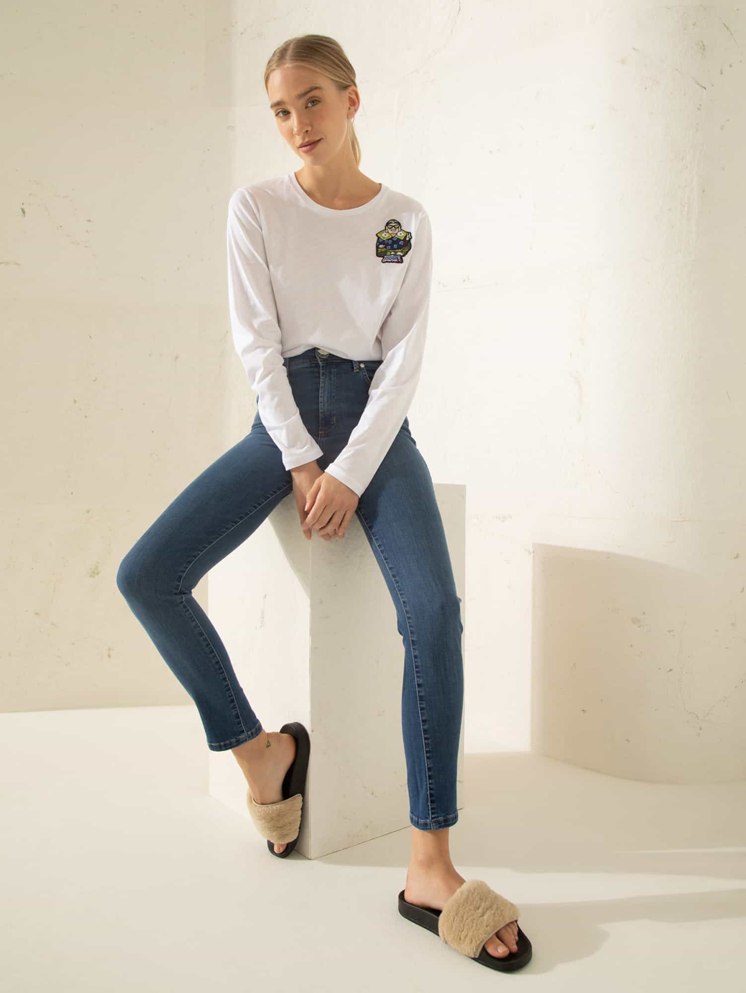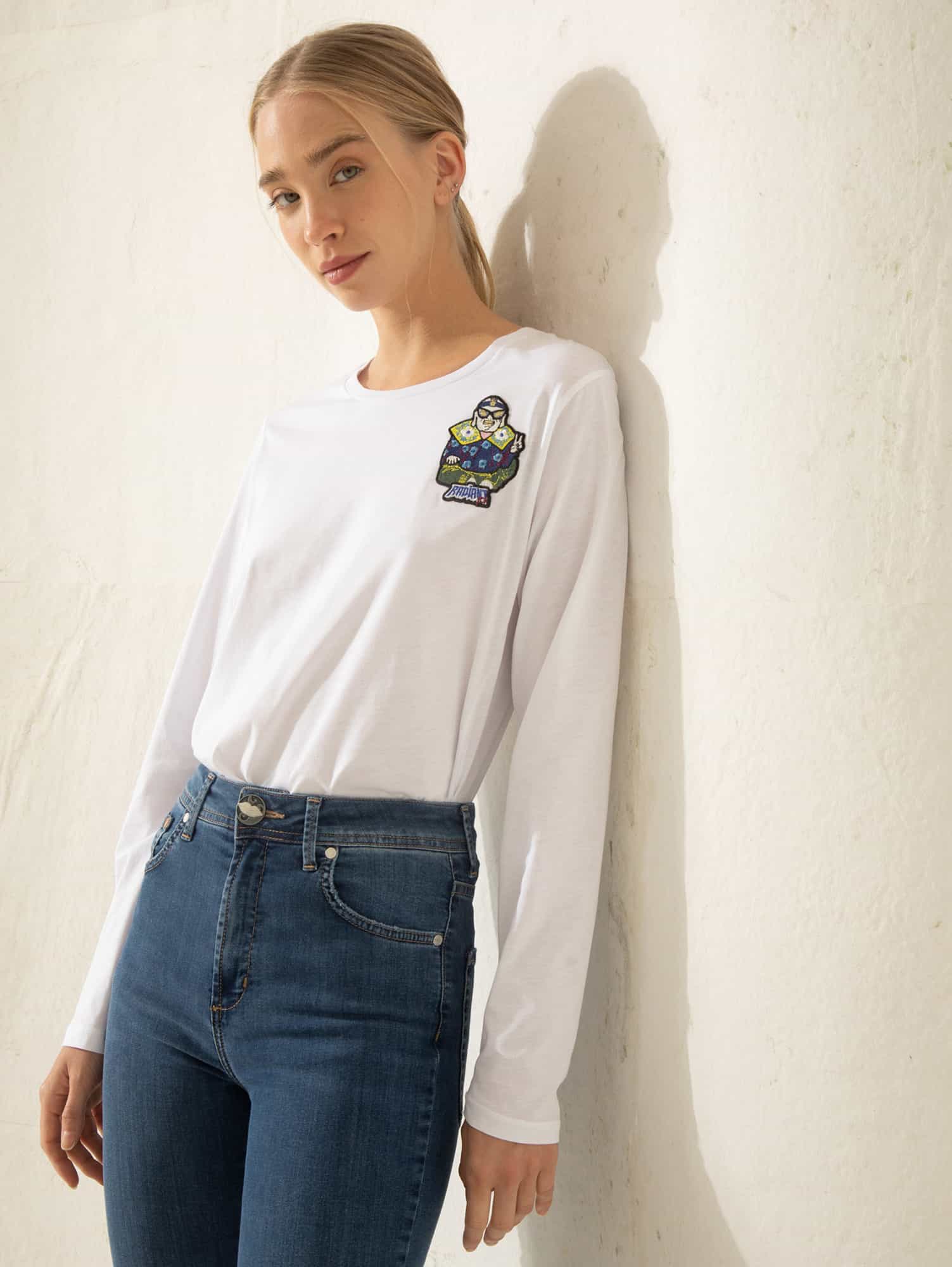 Camiseta confeccionada en algodón pima 100%. Fit clásico y holgado, con escote redondo tejido y mangas largas. Sobre los laterales tiene recortes que se funden hacia el delantero terminando en pequeños tajos. Incluye parche Buda bordado en el frente.