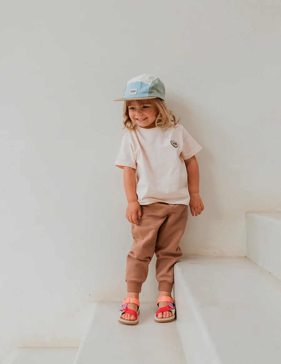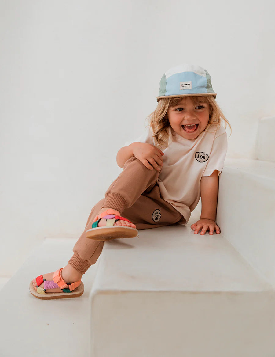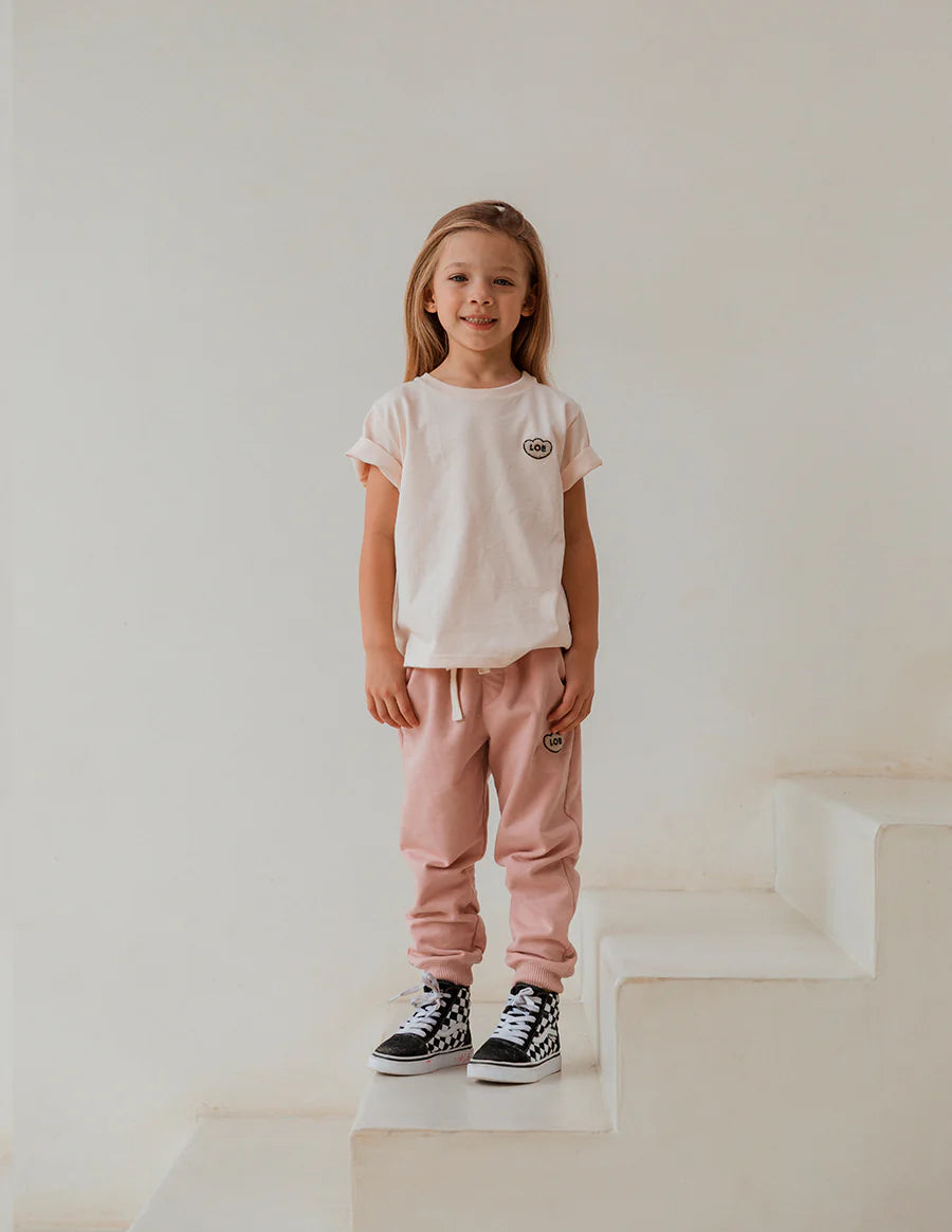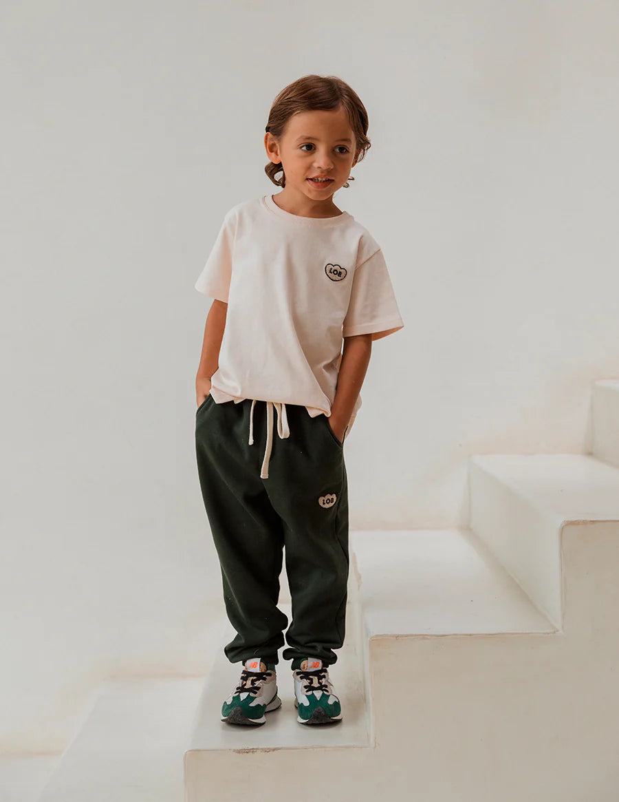 Camiseta infantil, para niñas y niños, con fit suelto, de manga corta, cuello redondo con rib y detalle de "LOB" bordado con textura súper suavecita en el pecho. Esta camiseta tiene un color marfil con un toque muuuuy ligero de rosa lo que la hace la camiseta infaltable en el closet de los más pequeños. Te aseguramos que una vez toques la tela te enamorarás de su suavidad y calidad. Y lo mejor! Es un tela de muy buen gramaje y por ser algodón 100% es fresquísima.