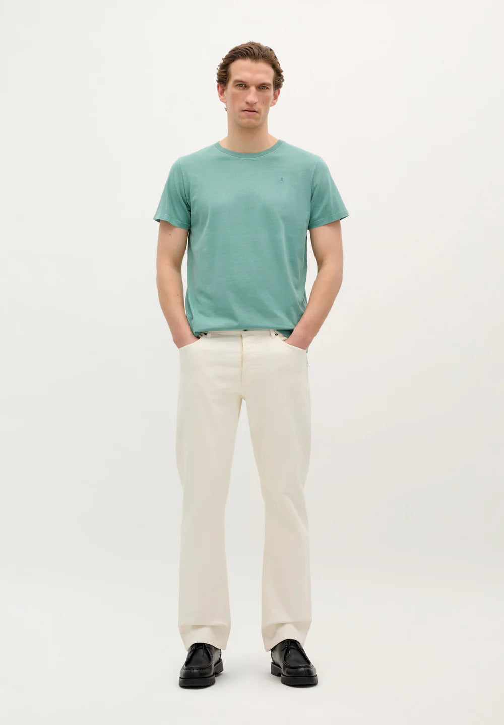 Camiseta desteñida 100 % algodón BCI. Corte regular, cuello redondo y manga corta. Detalle de calavera bordada a juego.
