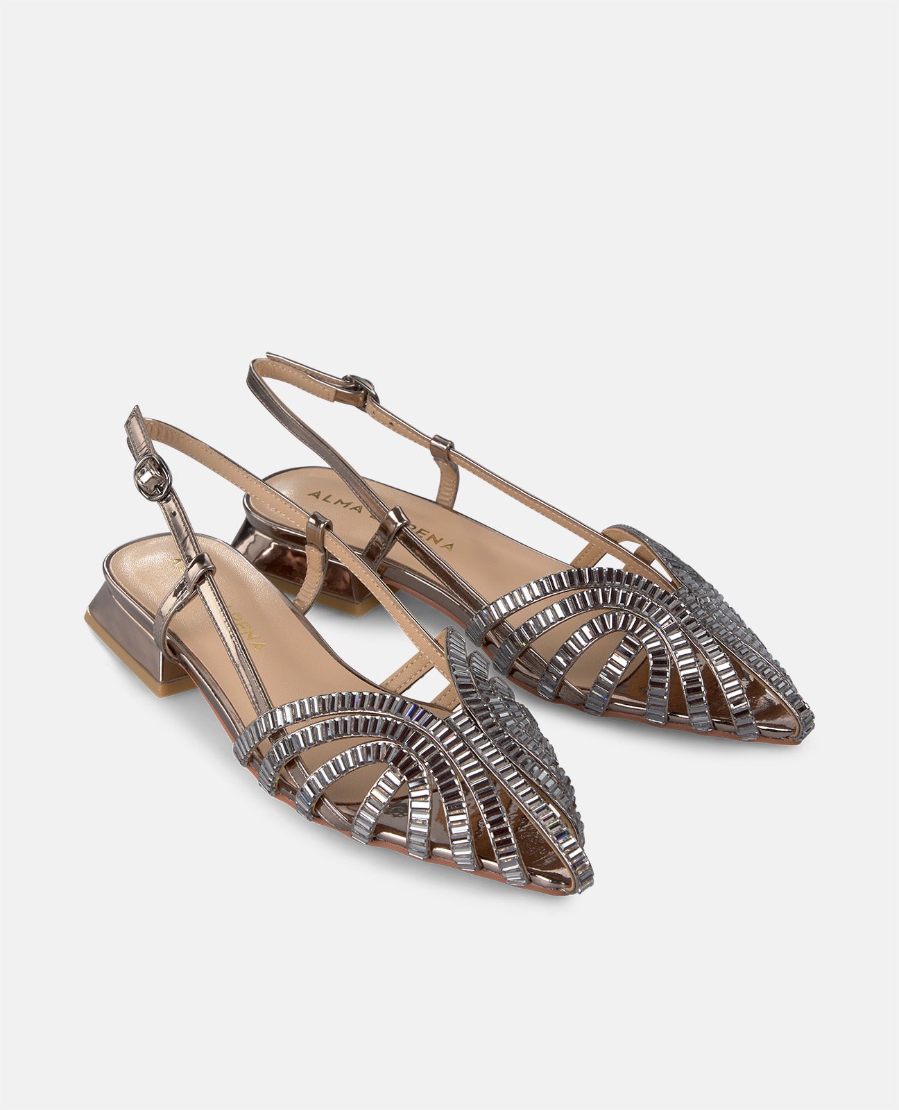 Zapato plano estilo cangrejera con puntera afilada y detalle de pedrería en la puntera. Con cierre de hebilla y la altura del tacón es de 2cm.