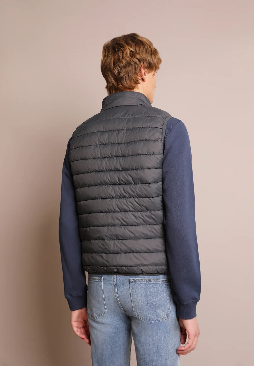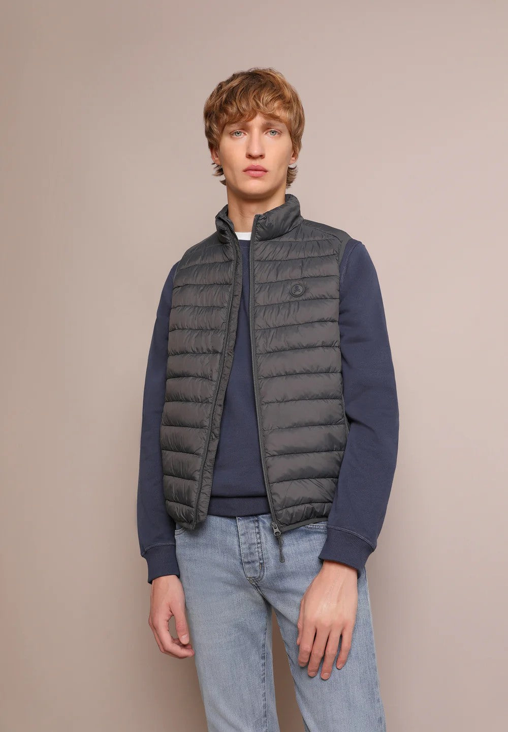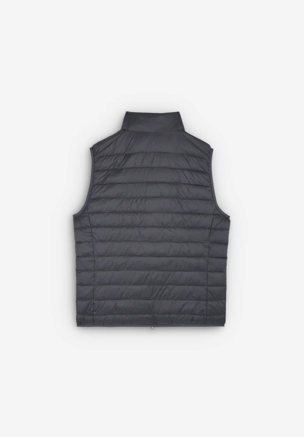 Chaleco acolchado con calavera. Confeccionado en poliéster reciclado. Corte Regular. Cuello alto. Cierre con cremallera. Bolsillos laterales.