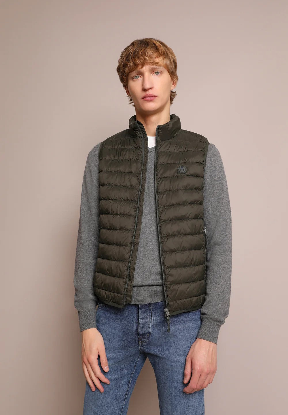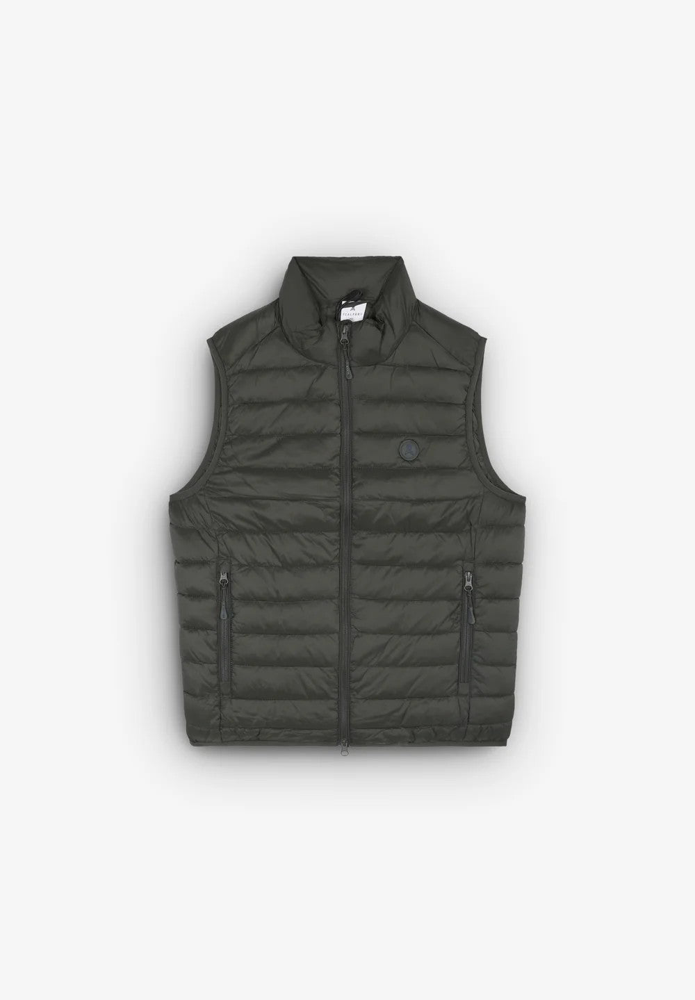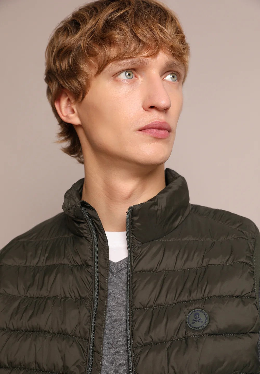 Chaleco acolchado con calavera. Confeccionado en poliéster reciclado. Corte Regular. Cuello alto. Cierre con cremallera. Bolsillos laterales.