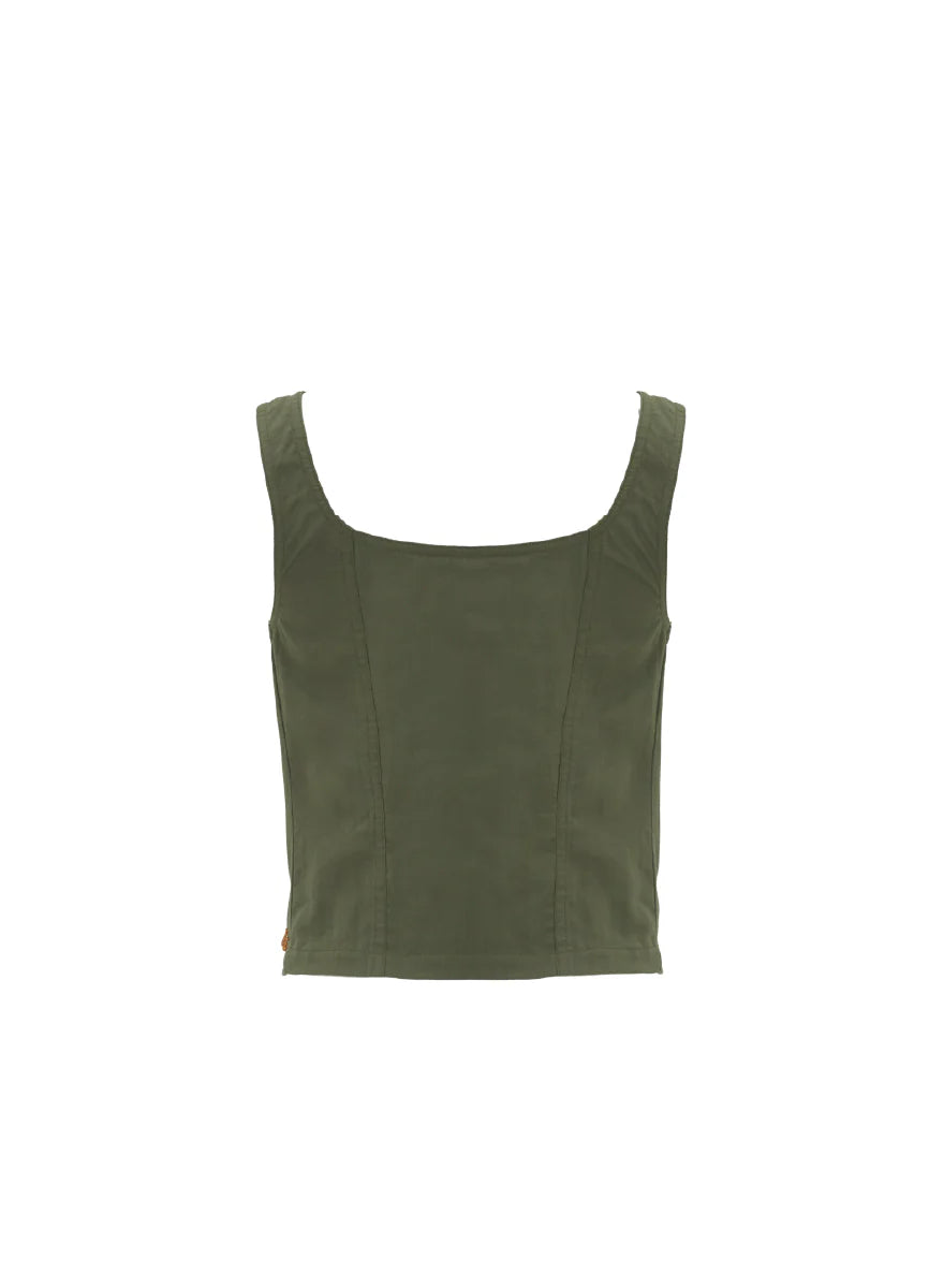 Una prenda que captura la esencia del estilo mediterráneo, el chaleco Dolly es la definición de elegancia relajada. Confeccionado en lino ligero color oliva oscuro, este top estilo chaleco presenta un favorecedor escote cuadrado y un delicado cierre frontal con cordones que permite un ajuste perfecto y estiliza la figura con sofisticación.