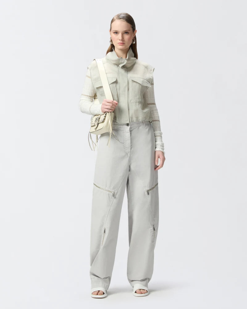 Chaleco corto de tejido ripstop resistente al desgarro con un acabado ultraligero similar a la organza. Esta prenda presenta detalles inspirados en la ropa de trabajo, como bolsillos de parche en la parte delantera, cuello alto y cordón ajustable en la parte inferior. Cierre de cremallera con tapeta en la parte delantera.