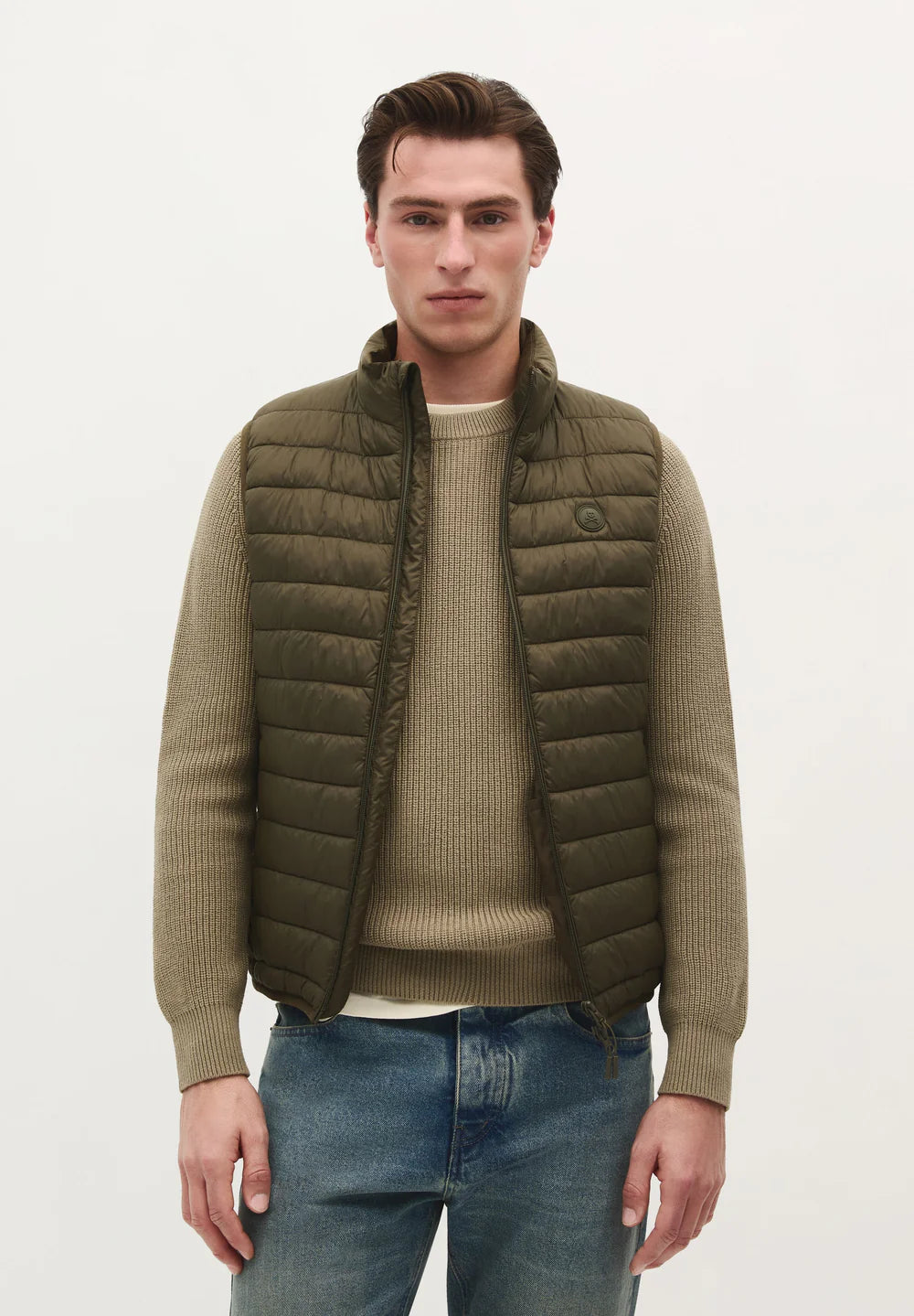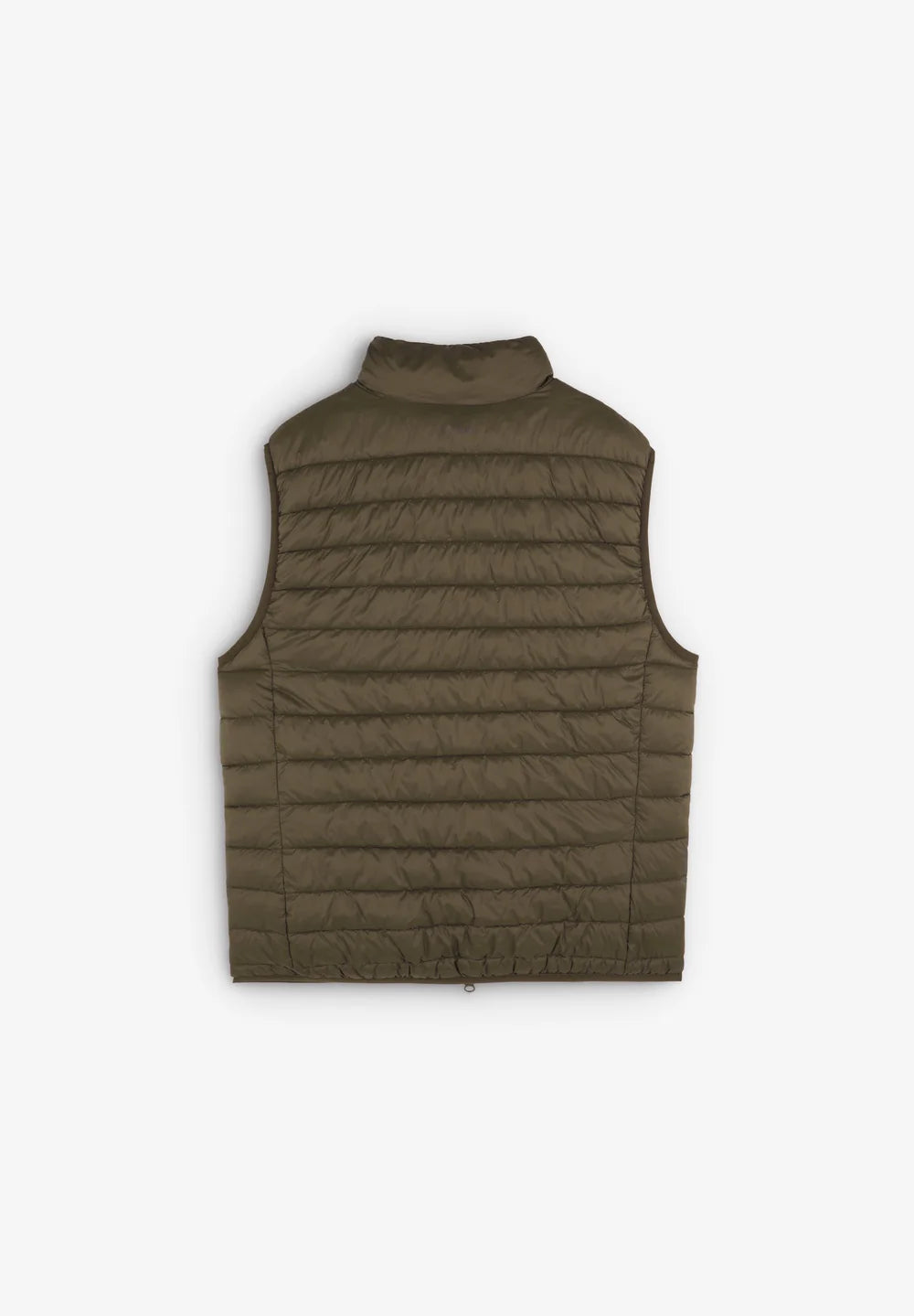 Chaleco acolchado confeccionado en tejido reciclado. Regular fit, cuello subido y cierre con cremallera de doble carro. Manga en sisa y bolsillos laterales con cremallera. Parche de calavera en pecho.