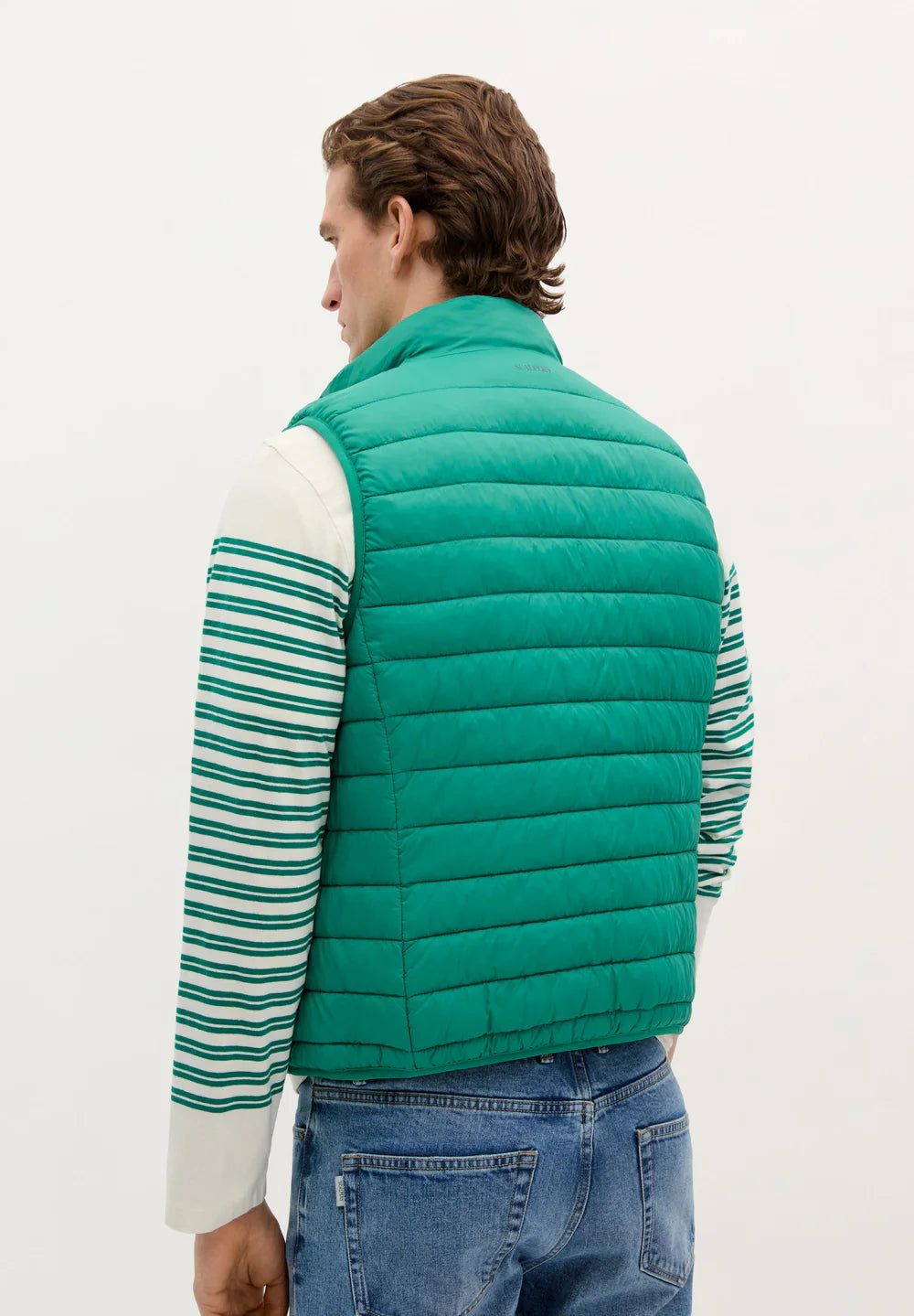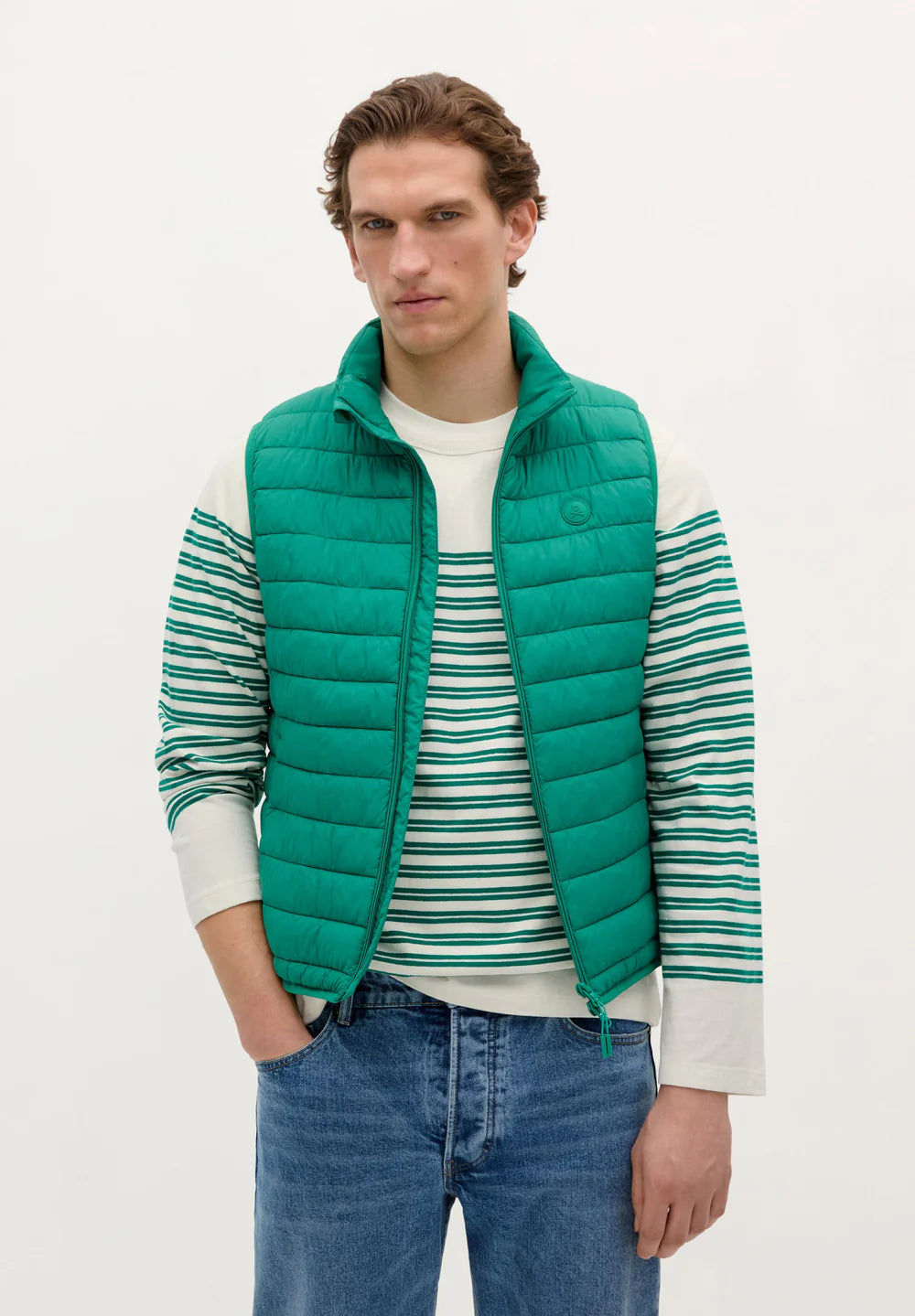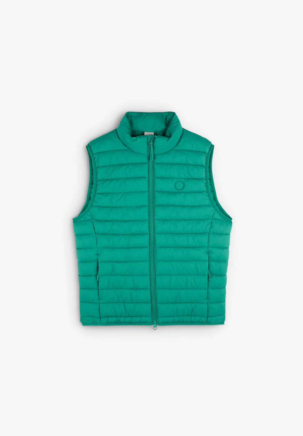 Chaleco acolchado confeccionado en tejido reciclado. Regular fit, cuello subido y cierre con cremallera de doble carro. Manga en sisa y bolsillos laterales con cremallera. Parche de calavera en pecho.