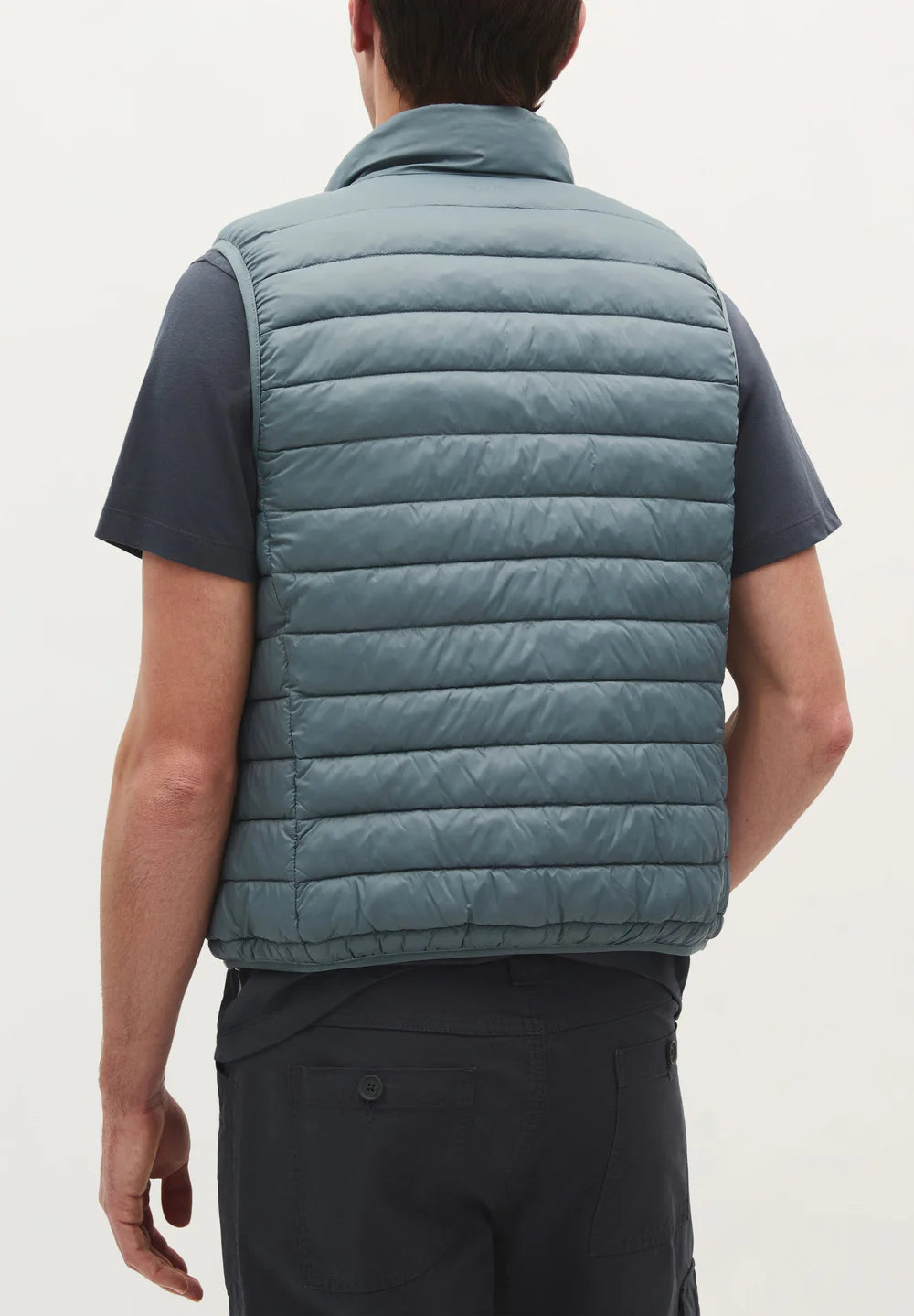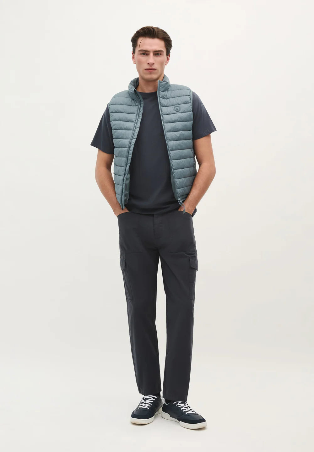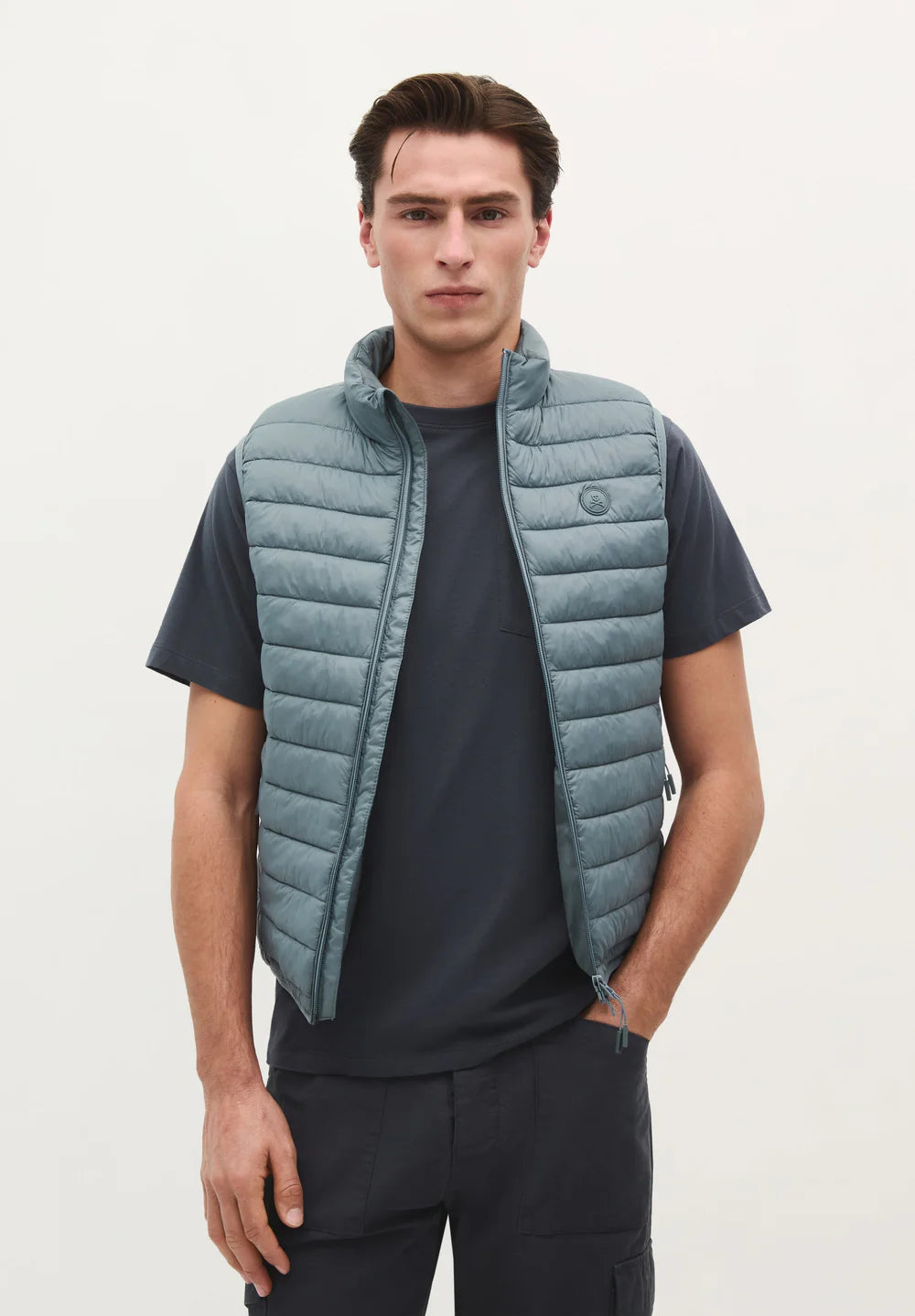 Chaleco acolchado confeccionado en tejido reciclado. Regular fit, cuello subido y cierre con cremallera de doble carro. Manga en sisa y bolsillos laterales con cremallera. Parche de calavera en pecho.