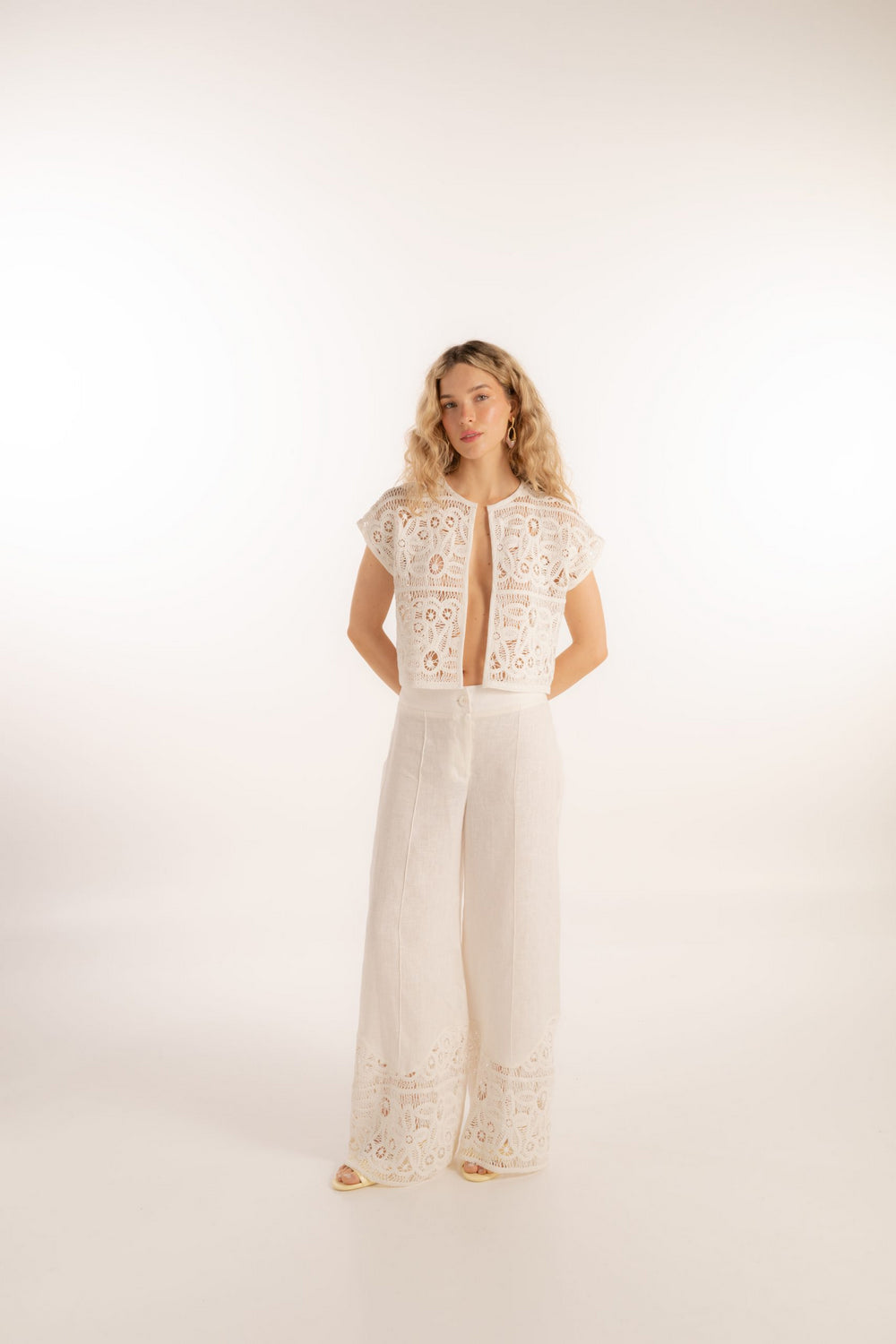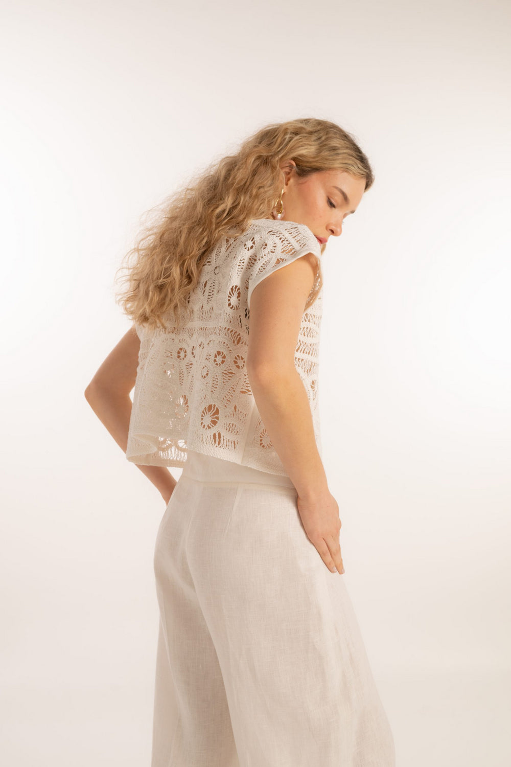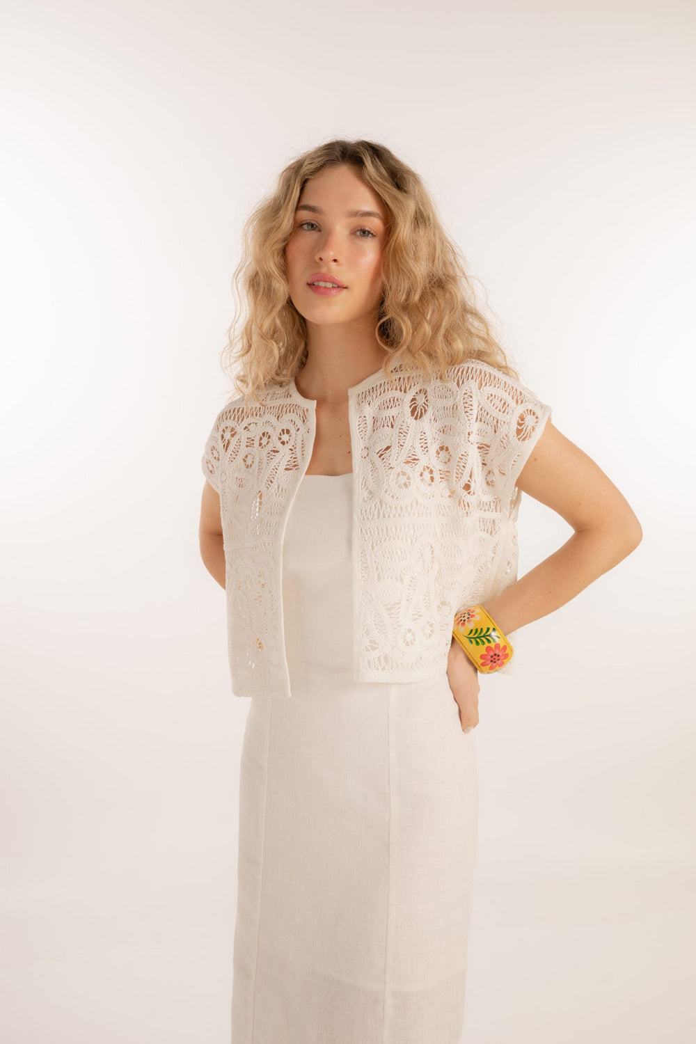 Chaleco corto en torchon con manga seguida y cuello redondo Una pieza única que combina delicadeza y estilo artesanal. Confeccionado en encaje torchon, este chaleco corto de manga seguida y cuello redondo es perfecto para elevar cualquier look. Su diseño femenino y versátil lo convierte en el complemento ideal para blusas, vestidos o tops básicos.