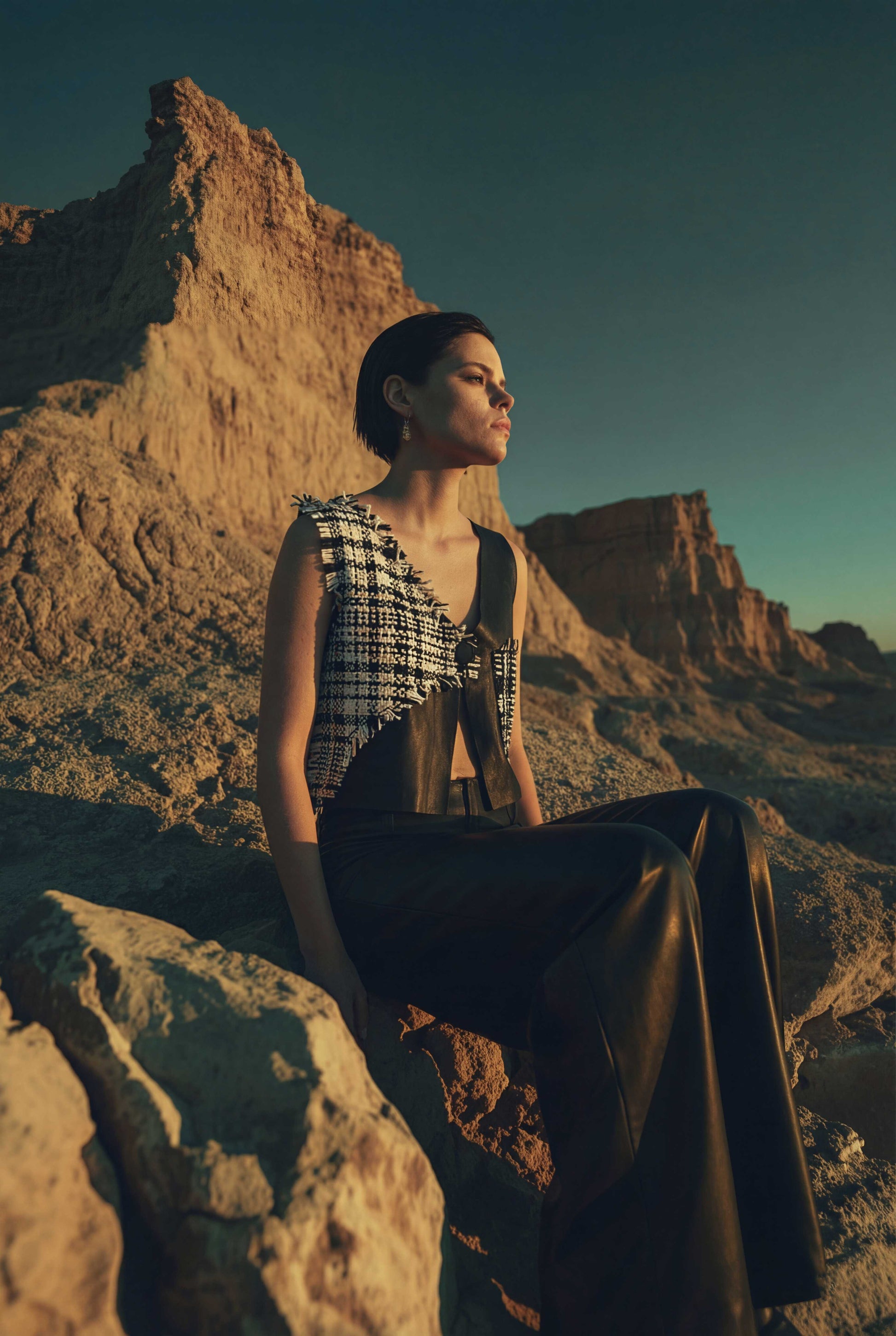 Top/chaleco de piel con finos cortes de 0,4 mm, tratado a mano en degradado mediante la técnica "tweed technical". Incluye un bolsillo lateral con acabado en tweed y un botón forrado en piel.