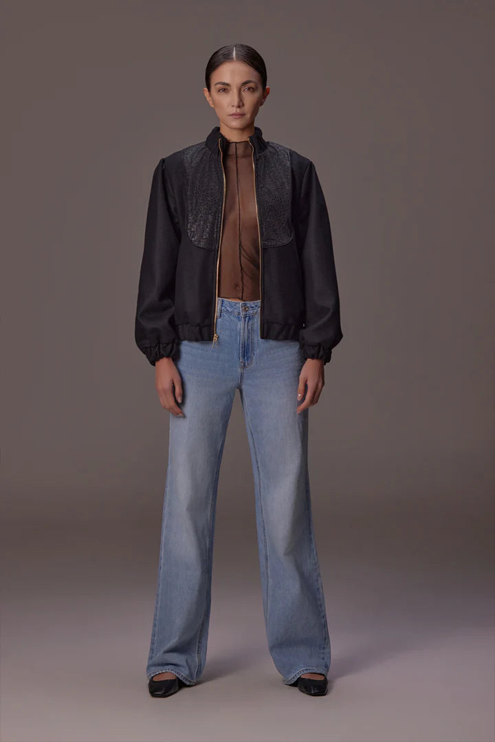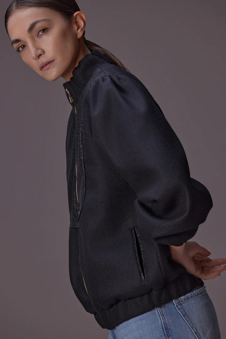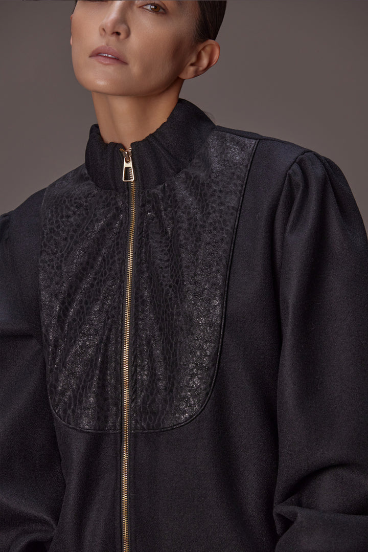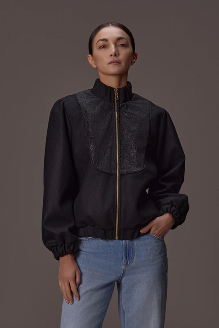 Esta increíble chaqueta está confeccionada en paño negro peruano, con un llamativo babero en cuero sintético italiano texturizado, cremallera dorada y un elegante forro morado. Esta combinación única convierte a esta prenda en una pieza esencial para cualquier clóset.