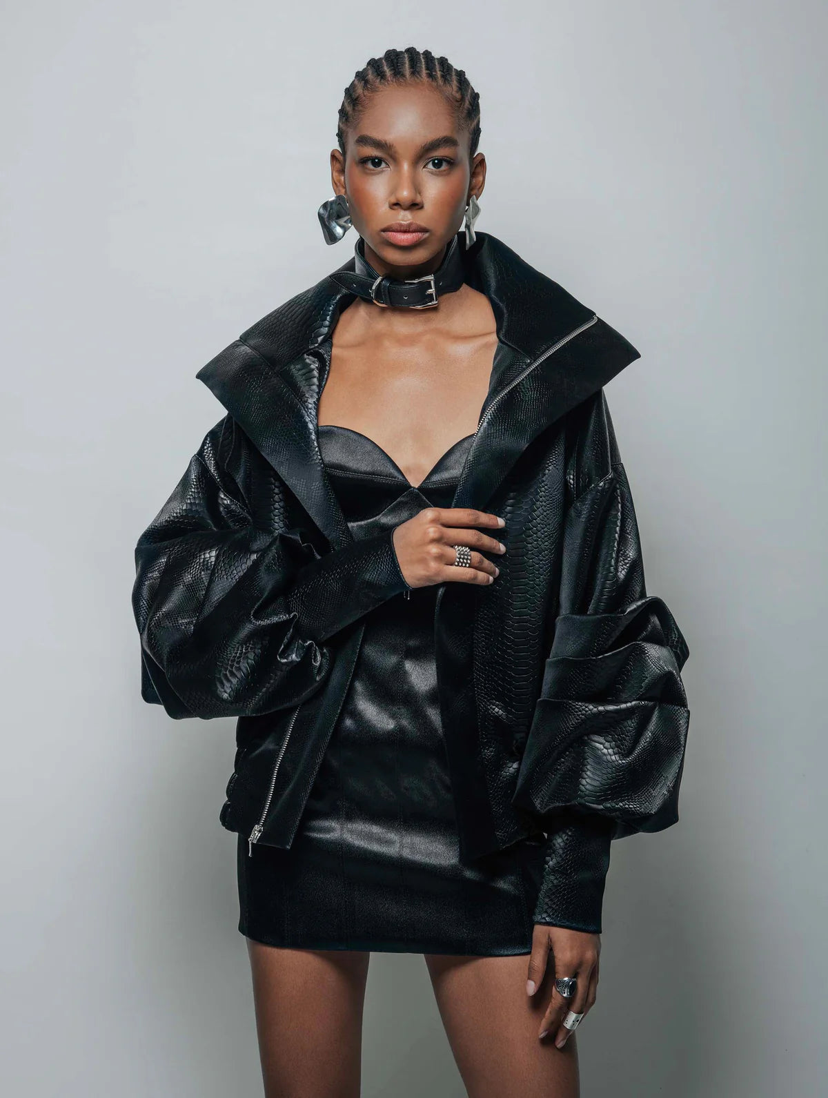 ESSEX. Una chaqueta bomber extragrande que difumina la línea entre lo sublime y lo funcional. Sus mangas drapeadas con pliegues, cuello alto, puños reforzados con cremallera, cintura elástica y cierre frontal oculto crean una silueta a la vez atrevida y fluida. Los discretos bolsillos interiores con cremallera realzan su practicidad, mientras que una inesperada cremallera metálica expuesta recorre el centro de la espalda, una elegante revelación de la precisión de su corte.