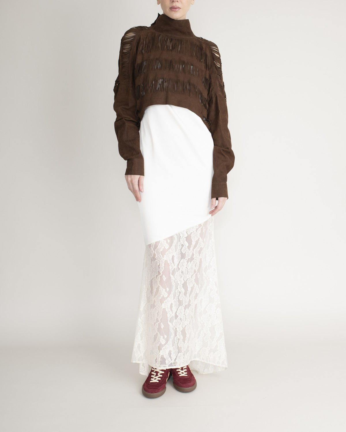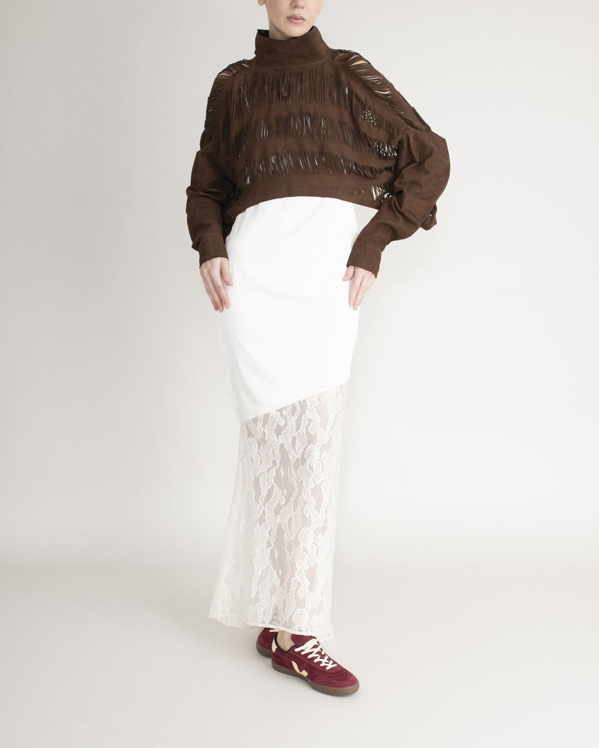 Chaqueta con finos cortes manuales en cueros livianos. Silueta amplia y comoda. Cortes en cuerpo delantero y posterior contrastados por mangas bajas lisas.