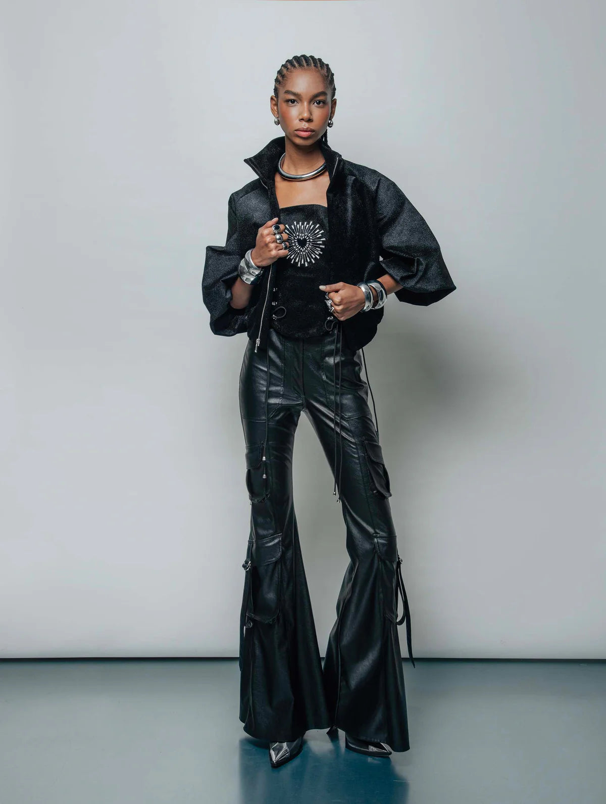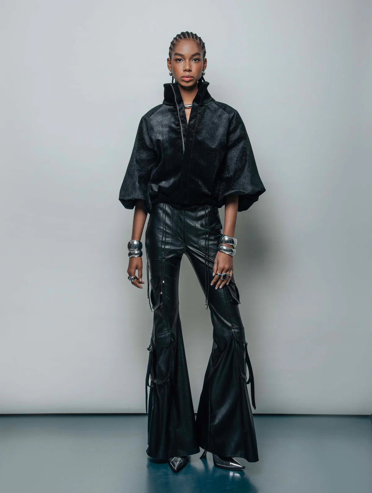 PHOENIX. Nuestra icónica chaqueta bomber fusiona la energía audaz de la ropa deportiva con la elegancia natural del lujo. Una voluminosa manga raglán 3/4 se extiende hasta un cuello alto, mientras que los bolsillos laterales con cremallera invisible y el cierre frontal oculto crean una silueta elegante y sin interrupciones. La cintura elástica realza su fluidez, y la espalda está adornada con el simbólico CF HEART, bordado en hilo plateado como un destello de brillo. Una obra maestra que reescribe las reglas del prêt-à-porter.