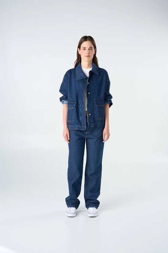 Una chaqueta relajada de mezclilla oscura con un estampado de rayas grabado con láser. Tiene cierre de cremallera y botones a presión, y está hecha 100 % de algodón.
