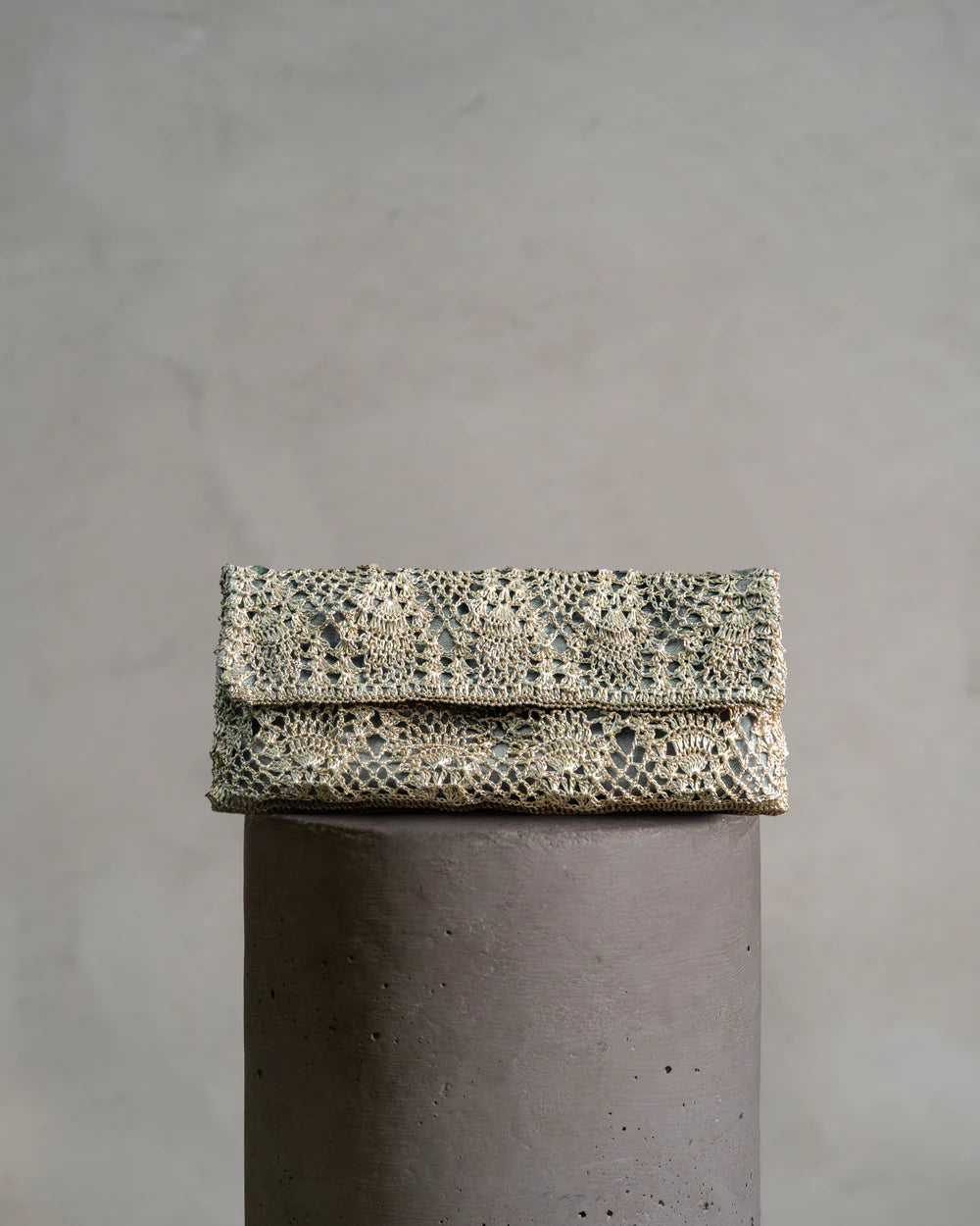 Clutch tejido a mano con un tejido de piña inspirado en la vibrante fauna y flora de Latinoamérica. Este clutch está elaborado con hilos de metal bañados en oro blanco y plata, con forro de terciopelo turquesa y cierre magnético.