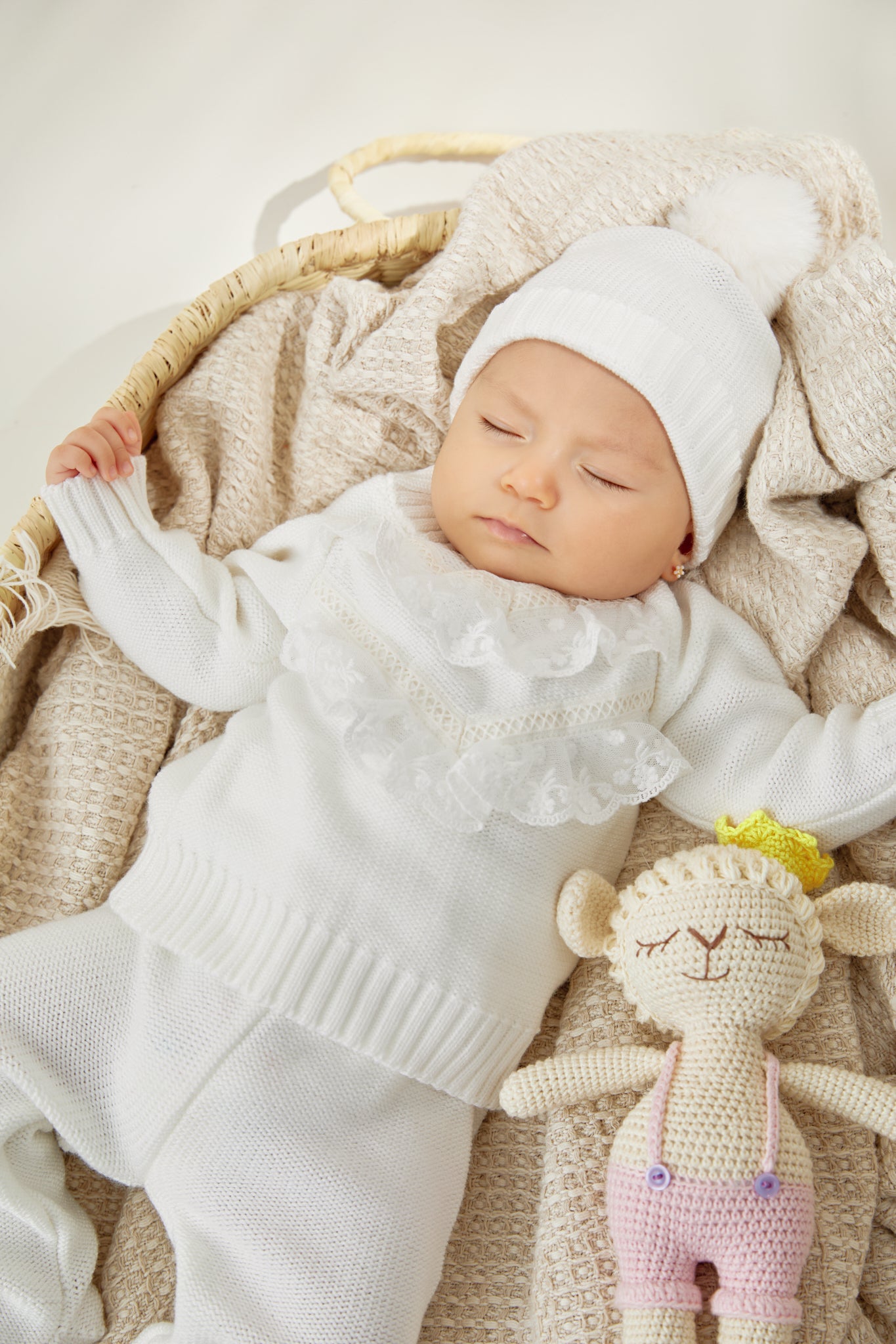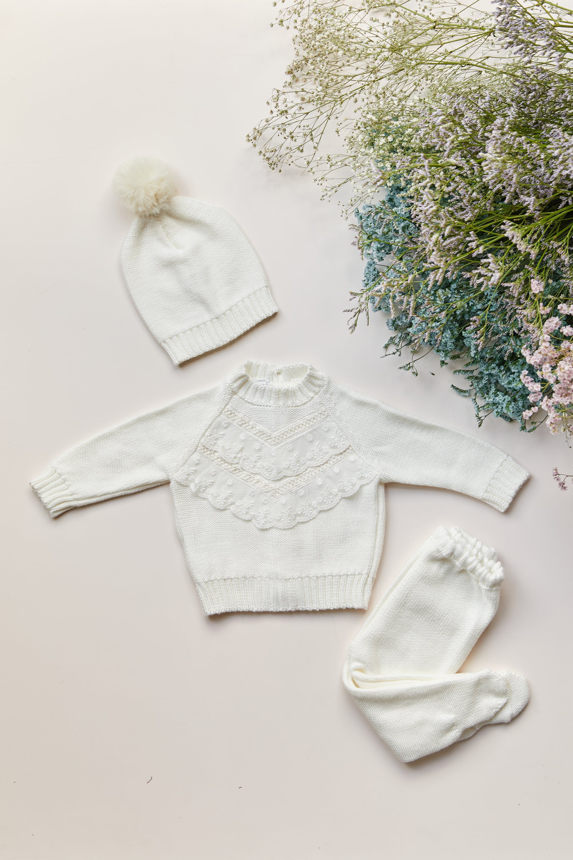 Set de tres piezas tejido, incluye buzo, pantalón y gorro. Delicado conjunto en color crudo con hermosos encajes españoles, ideal para vestir a tu princesa.