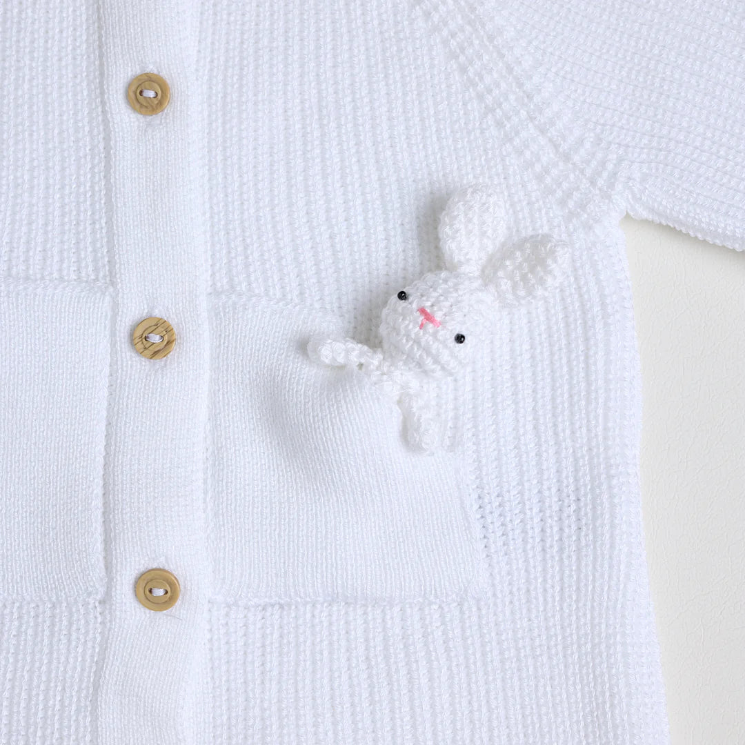 Enterizo manga larga con motivo de conejo, ideal para los primeros meses. En el bolsillo, trae un tierno conejito que se puede quitar y poner. Incluye gorro con orejas de conejo. Tela acanalada muy suave y perfecta para abrigar a tu bebé. Cerrado con botones desde la parte superior (cuello) hasta la parte inferior (tobillo) para mayor facilidad a la hora de vestir el bebé.