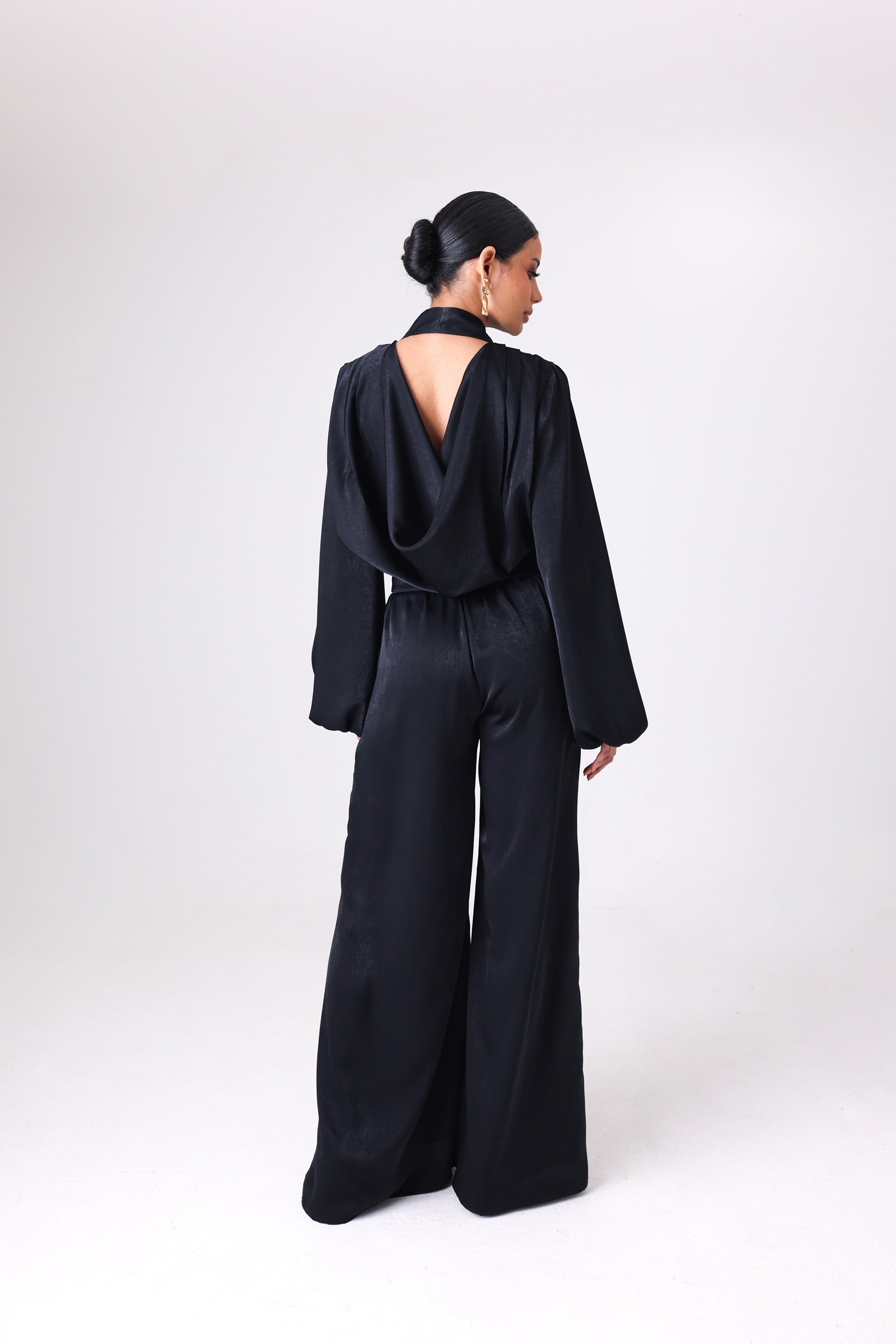 El mono Coral es una sofisticada prenda de seda, perfecta para un look de cóctel. Presenta mangas largas, pantalones anchos y un sutil escote en V. Un cinturón a juego completa el look con elegancia, aportando un toque refinado.