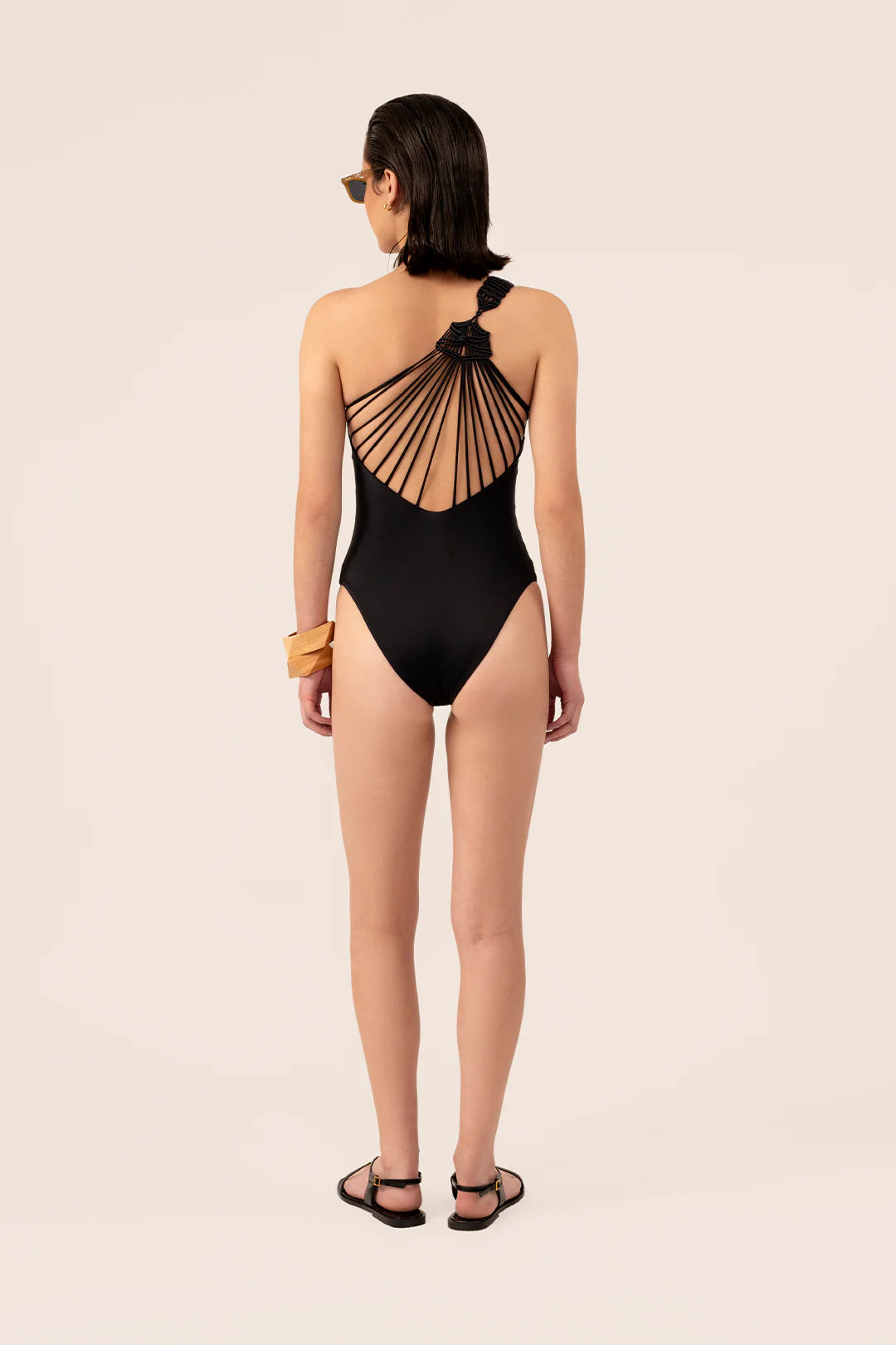 Entero pardus asimétrico en tono negro, con detalle distintivo de macramé cuidadosamente trabajado de forma artesanal, realzando la feminidad y el estilo único de la prenda. una pieza ideal para cualquier ocasión de uso, para aquellas mujeres que buscan una opción chic y con un toque artesanal diferenciador, confeccionado en materiales de alta calidad, brindando un ajuste perfecto para esos días en la playa.
