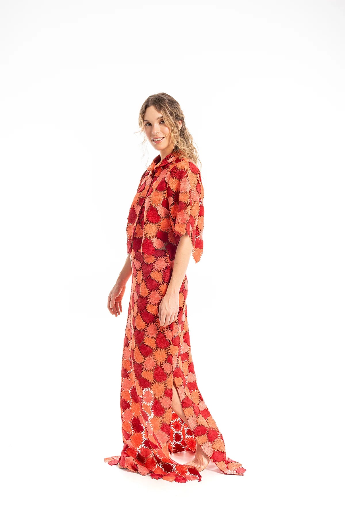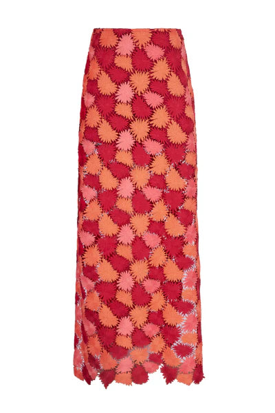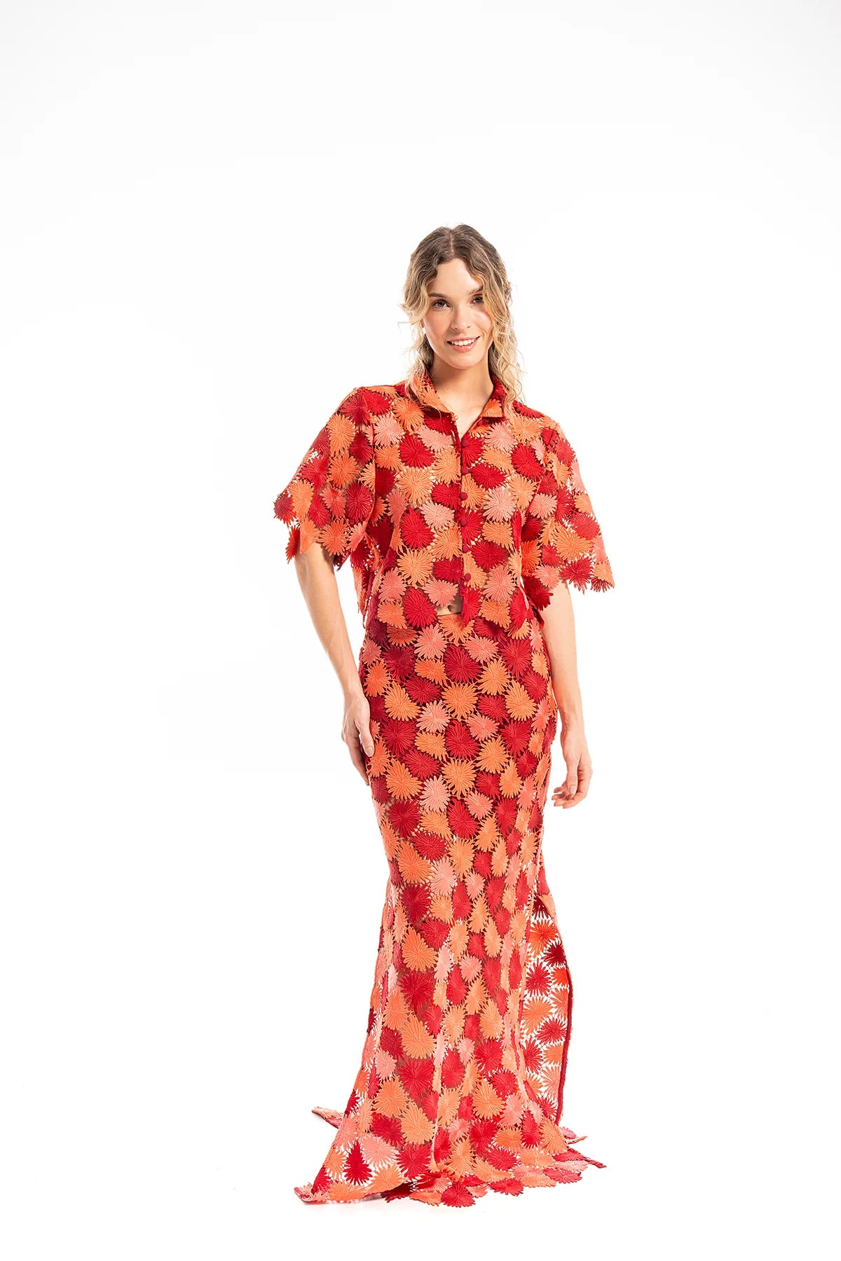 Nuestra falda Azalea es una falda larga con aberturas en los costados. Tiene cremallera en costado y pretina interna. La tela es un texturizado floral. Composición de la tela: 100% Poliester.