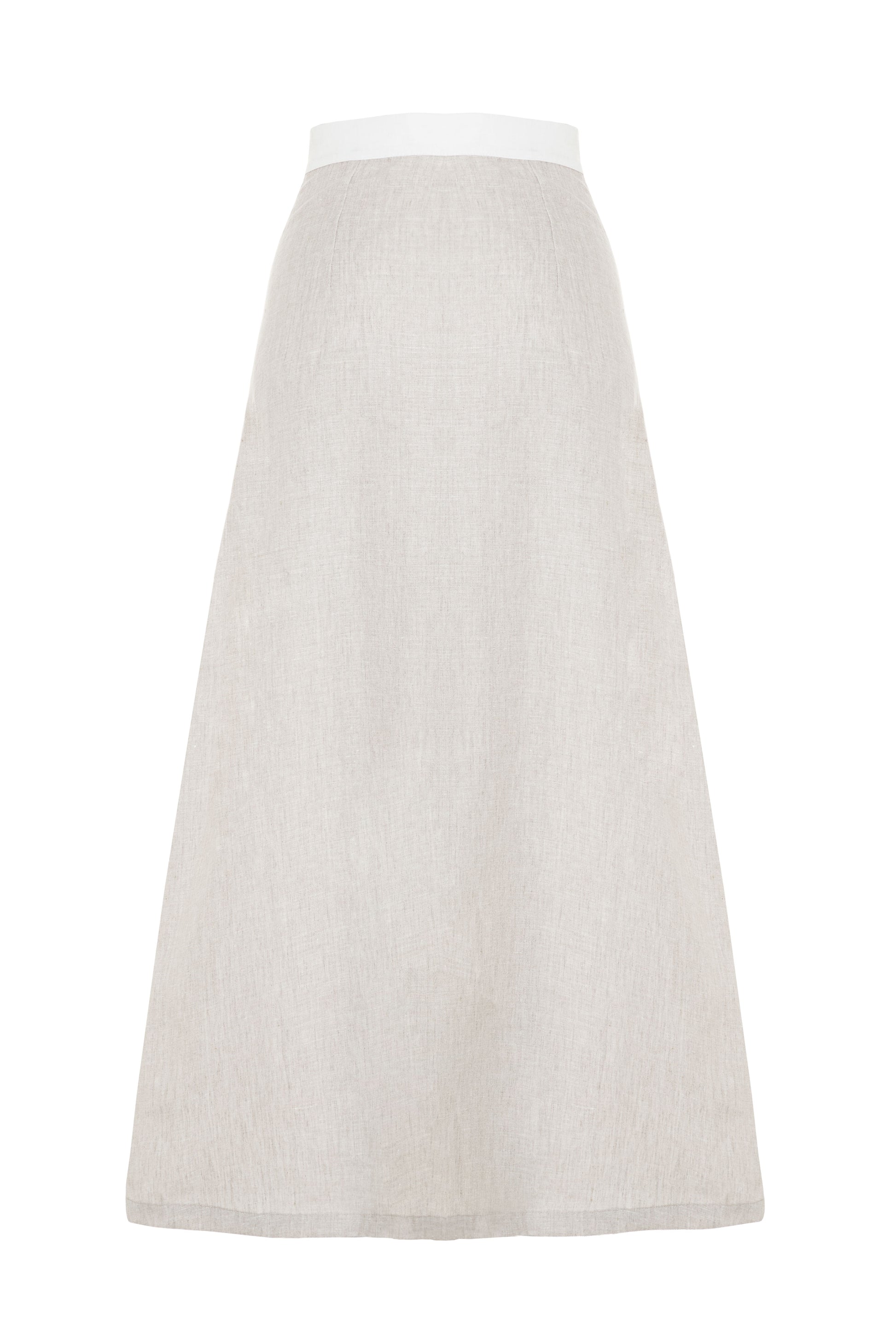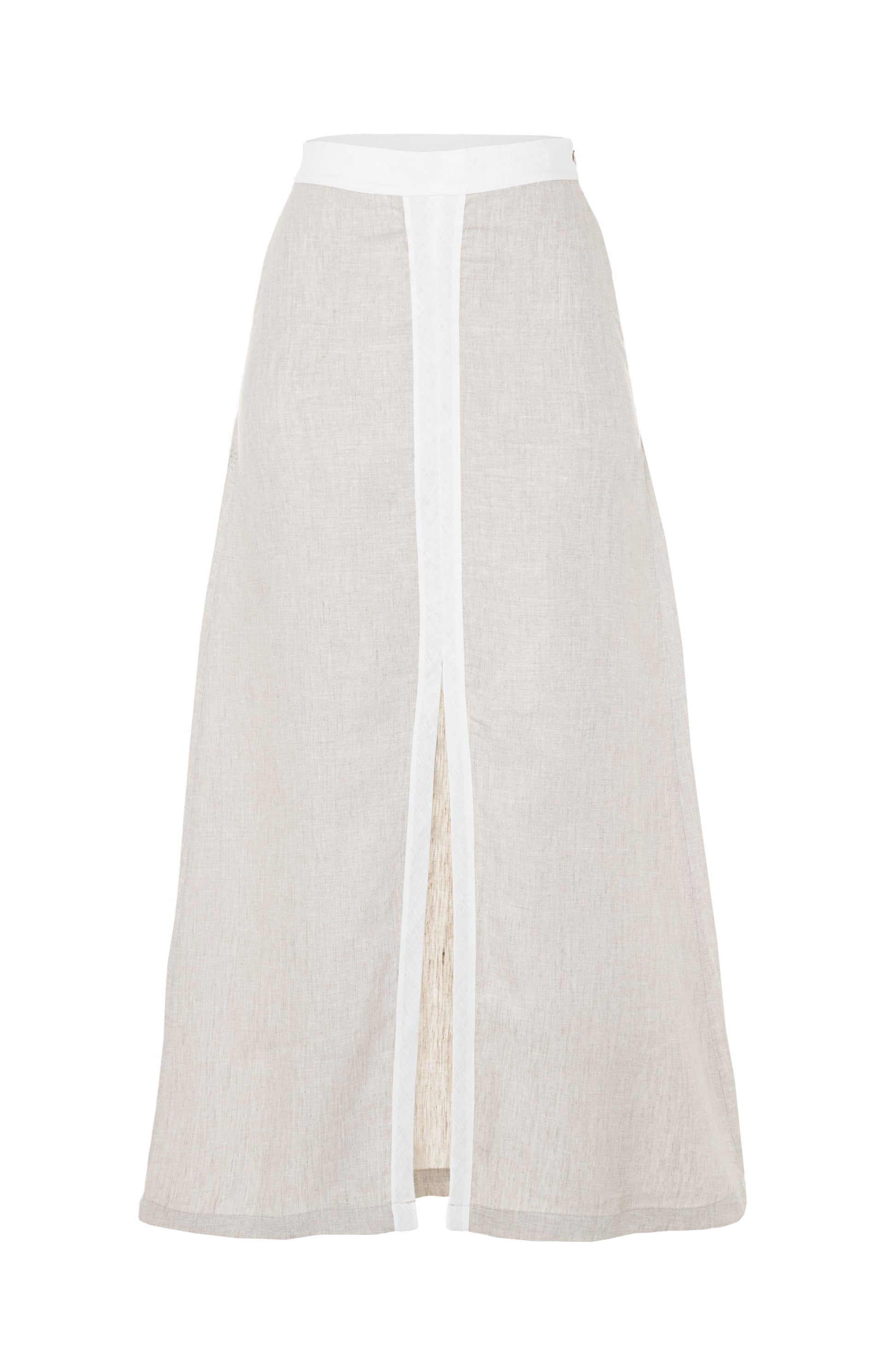 Falda larga con silueta de linea A y una abertura central. Constraste en color Ivory. Dos formas de uso.