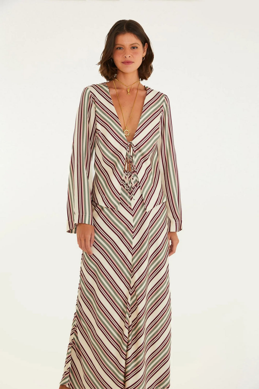 Falda de rayas Licor. Con un corte fluido y cintura alta, esta prenda irradia frescura y modernidad. Las rayas alargadas crean un movimiento único, perfecta para ocasiones informales o eventos especiales. El tacto suave de la tela proporciona comodidad durante todo el día. Combínala con blusas lisas para realzar el look.