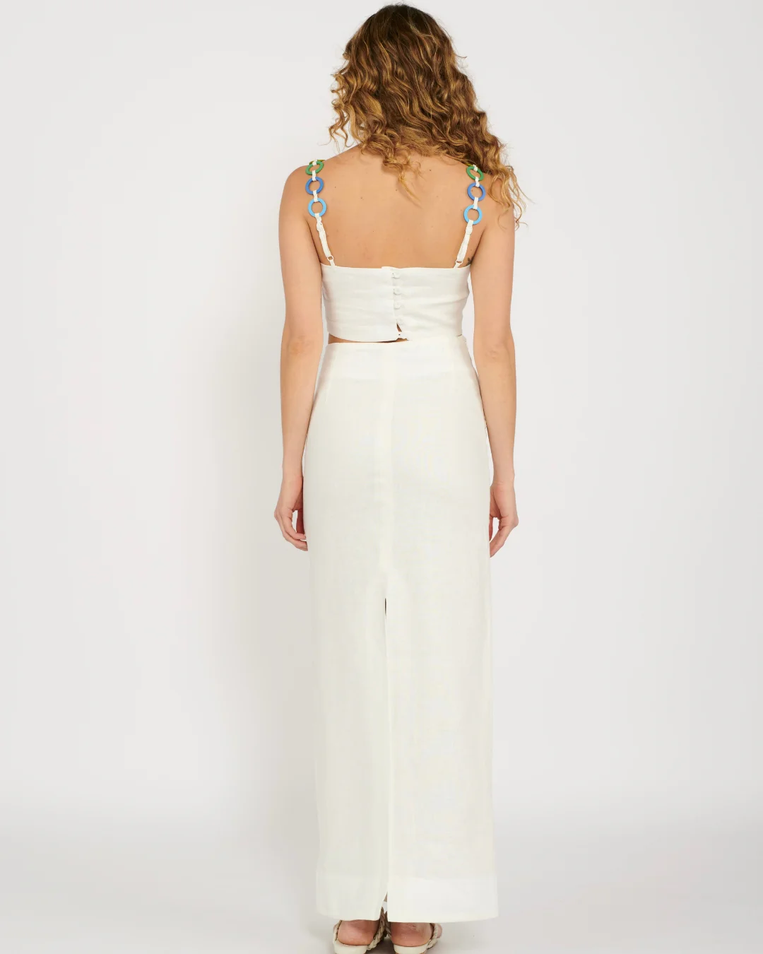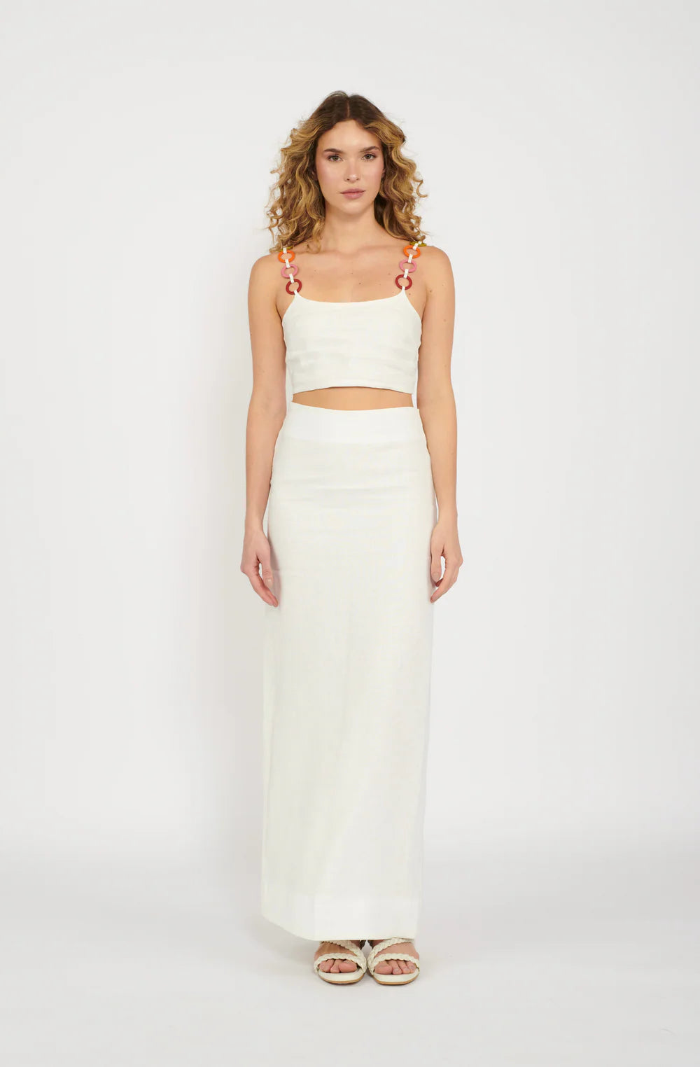 Falda larga con una ligera abertura en la parte de atrás, hecha a mano. Debido a este proceso artesanal, cada pieza es única