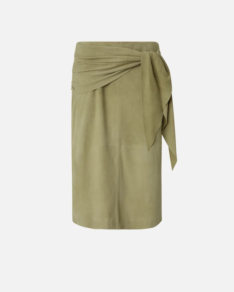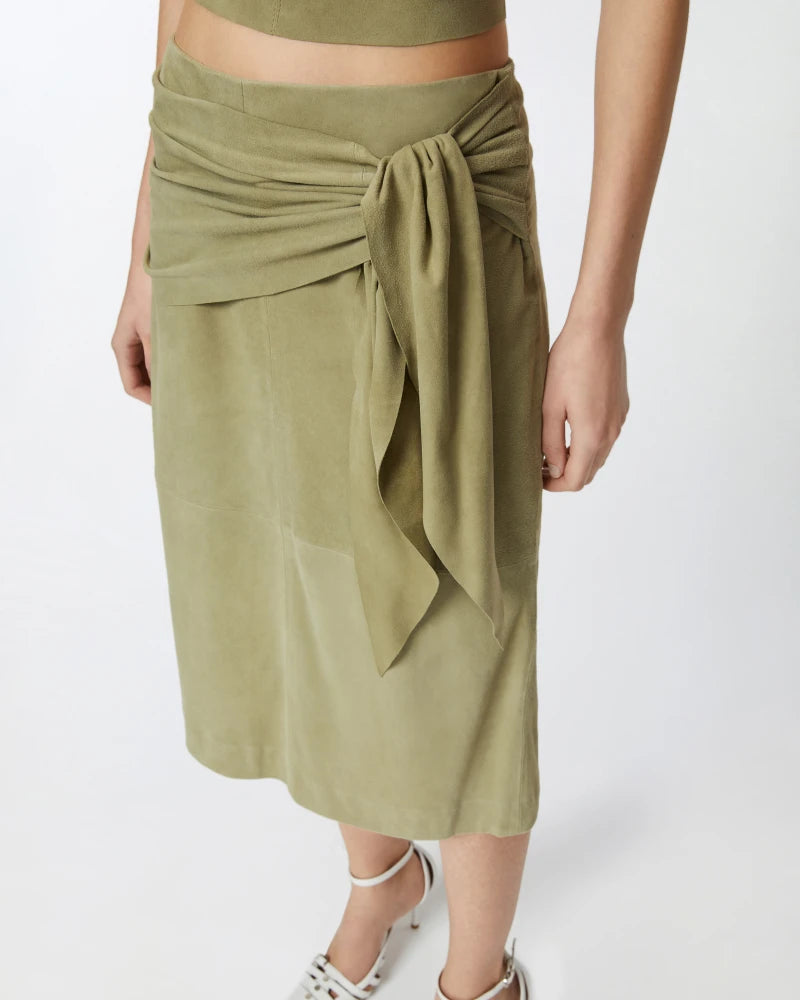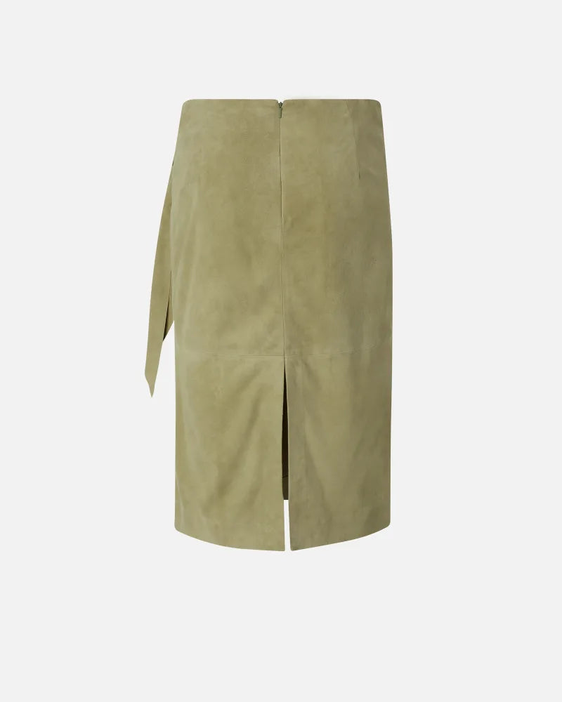 Falda de corte recto en ante con una textura especial y muy suave similar al melocotón. Esta falda, hasta la rodilla, se completa con un detalle de nudo lateral que simula un fajín abrochado y una abertura central en la parte inferior de la espalda. El forro interior de tela garantiza la máxima comodidad. Cierre con cremallera invisible en el centro de la espalda. Combínala con el top corto de ante del mismo color para un look atrevido y femenino de pies a cabeza.