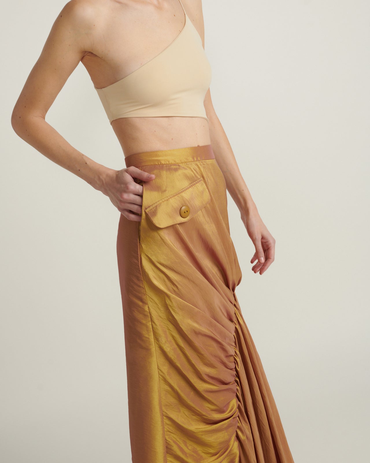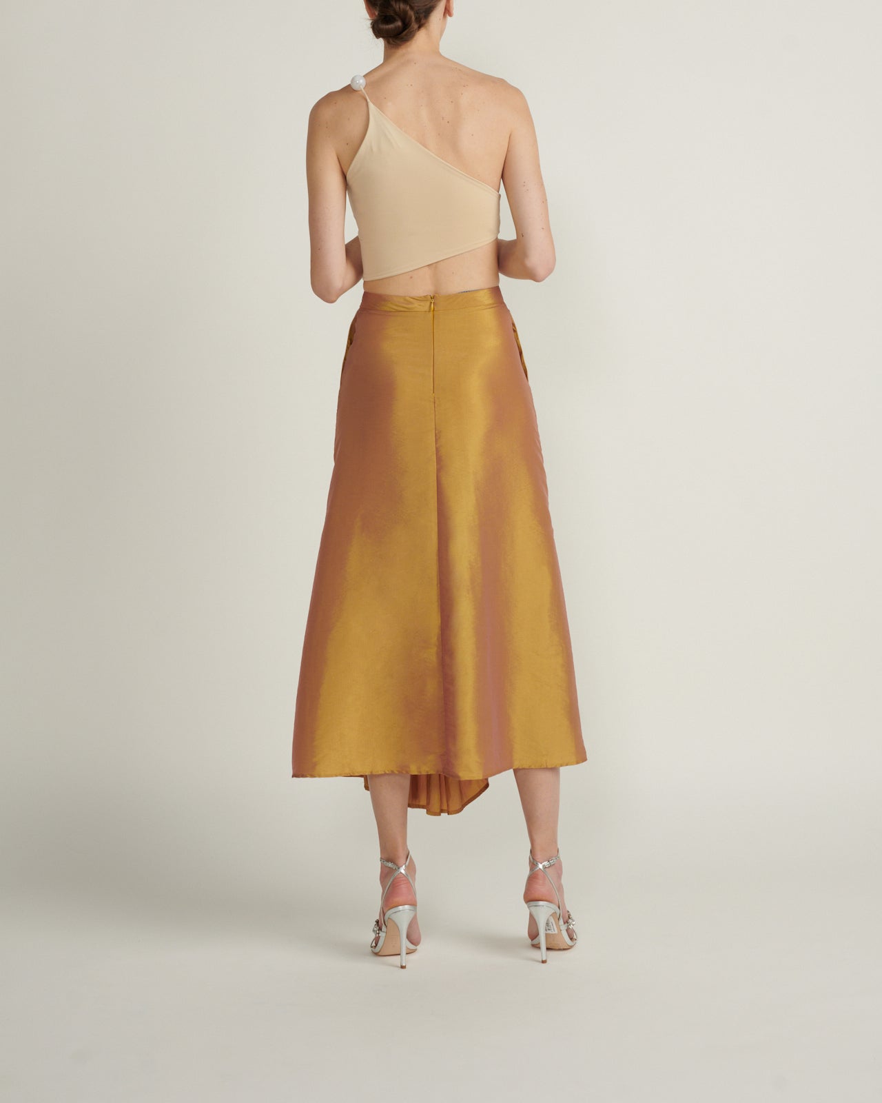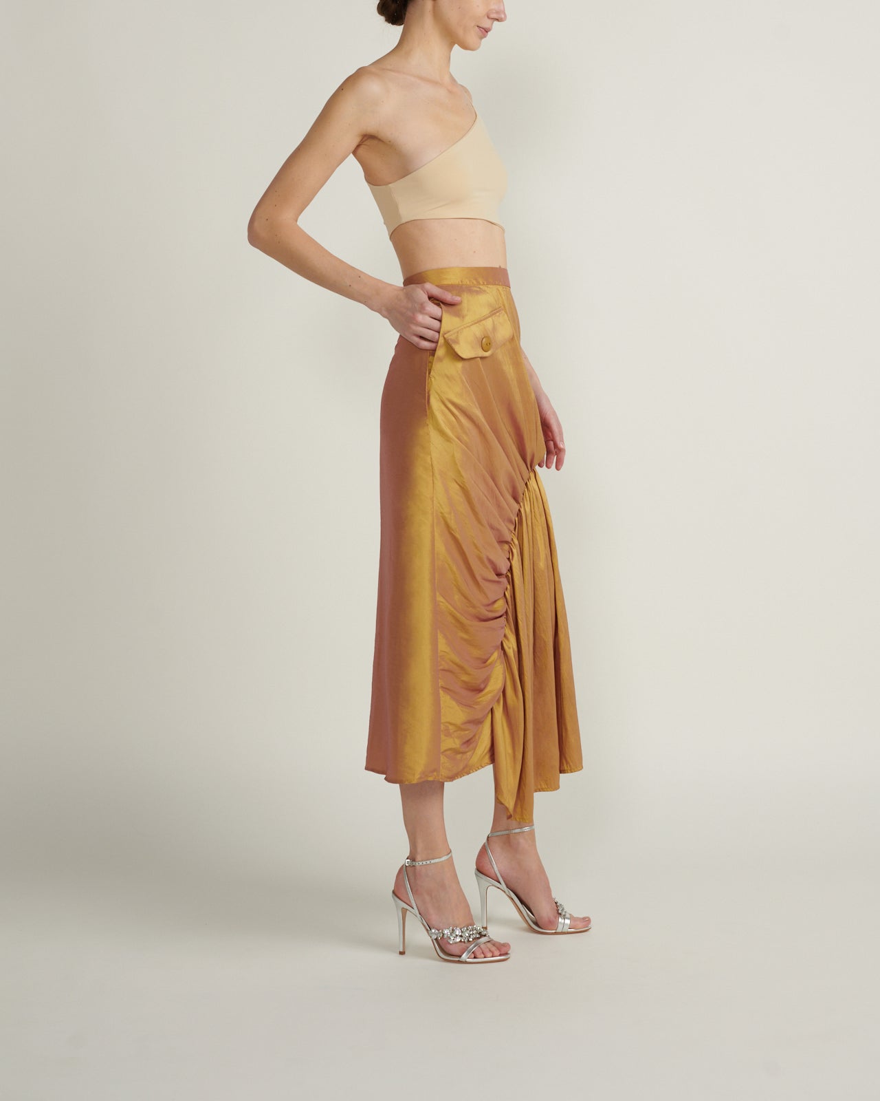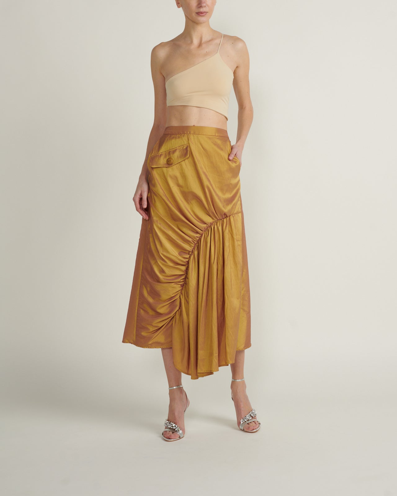 Falda midi en Tricolina texturizada, de corte asimético con recogido y detalle de tapeta de bolsillo en delantero. Cierre lateral con zip invisible.