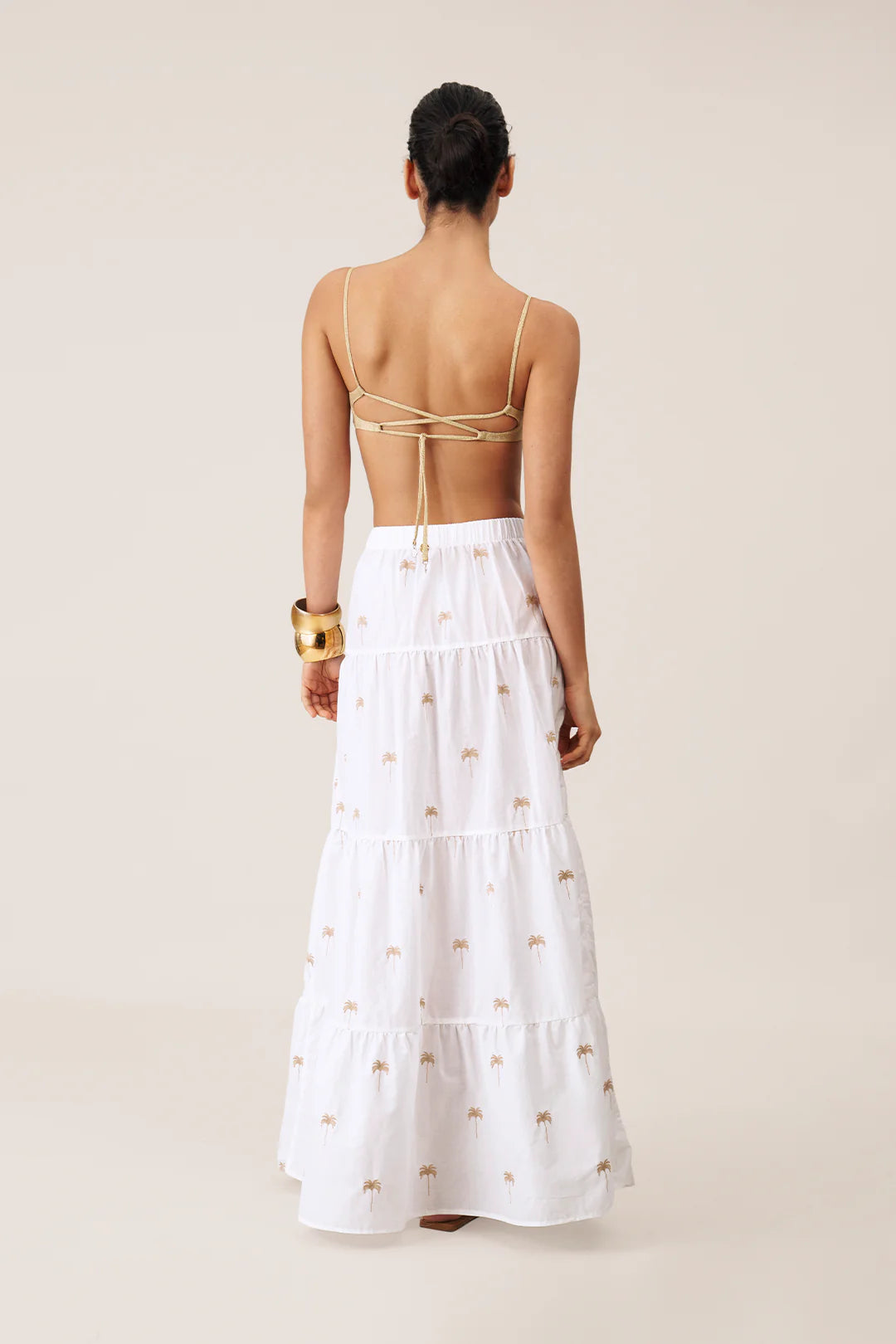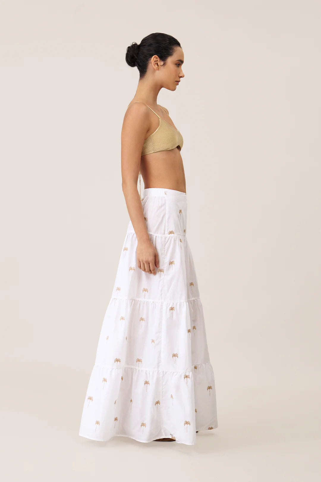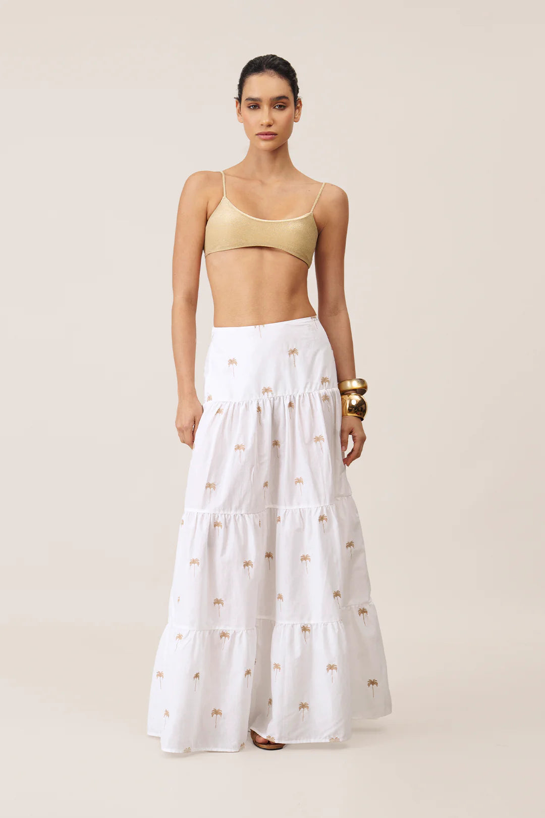 Falda thai larga con elástico en cintura posterior para brindar un ajuste perfecto, esta pieza resaltada por detalles bordados en forma de palmeras, una prenda con la cual te sentirás única, femenina y brindará a tus looks un toque de sofisticación.