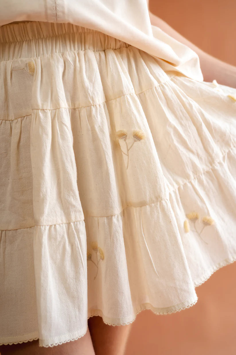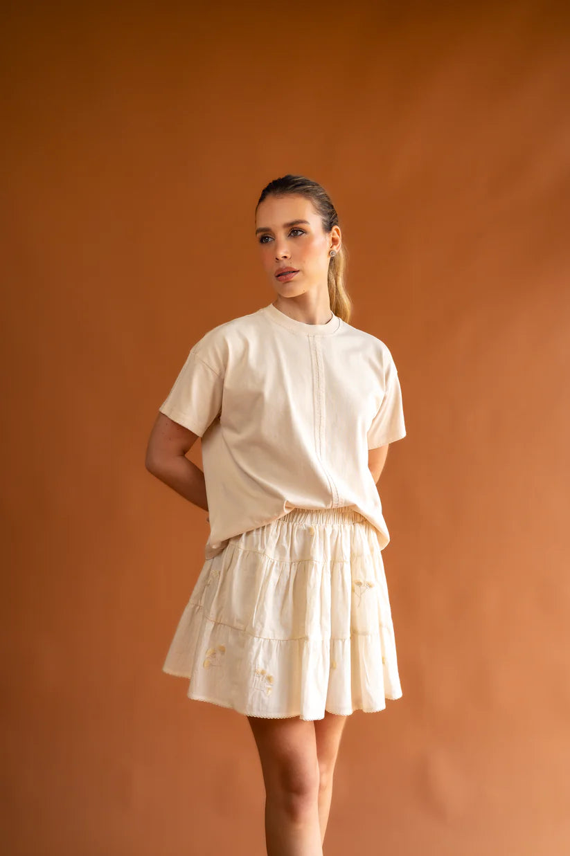 Falda en 100% algodón con bordados, elástico en pretina, forro interno.