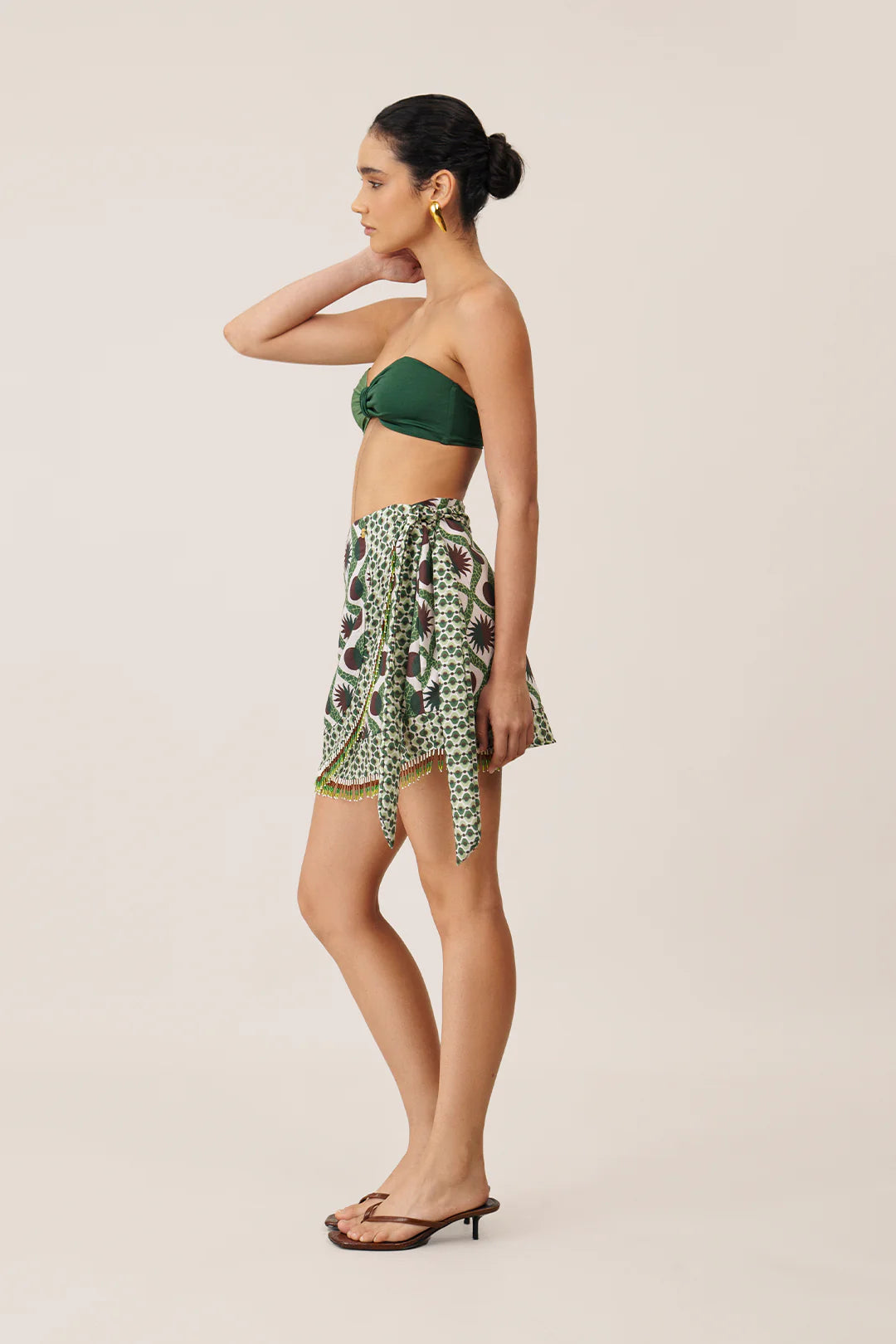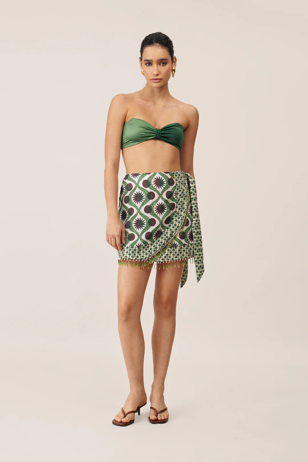 Falda veda con cintura anatómica para anudar en lateral, con un estampado inspirado en el resplandor cálido del sol y las olas rompiendo en el mar en esa sensación de nostalgia y libertad que se captura en cada destino tropical, una prenda con la cual te sentirás única, femenina y sofisticada, esta pieza resaltada por un hermoso detalle manual realizado por mujeres cabeza de familia y jóvenes en proceso de resocialización por aproximadamente 6 horas.