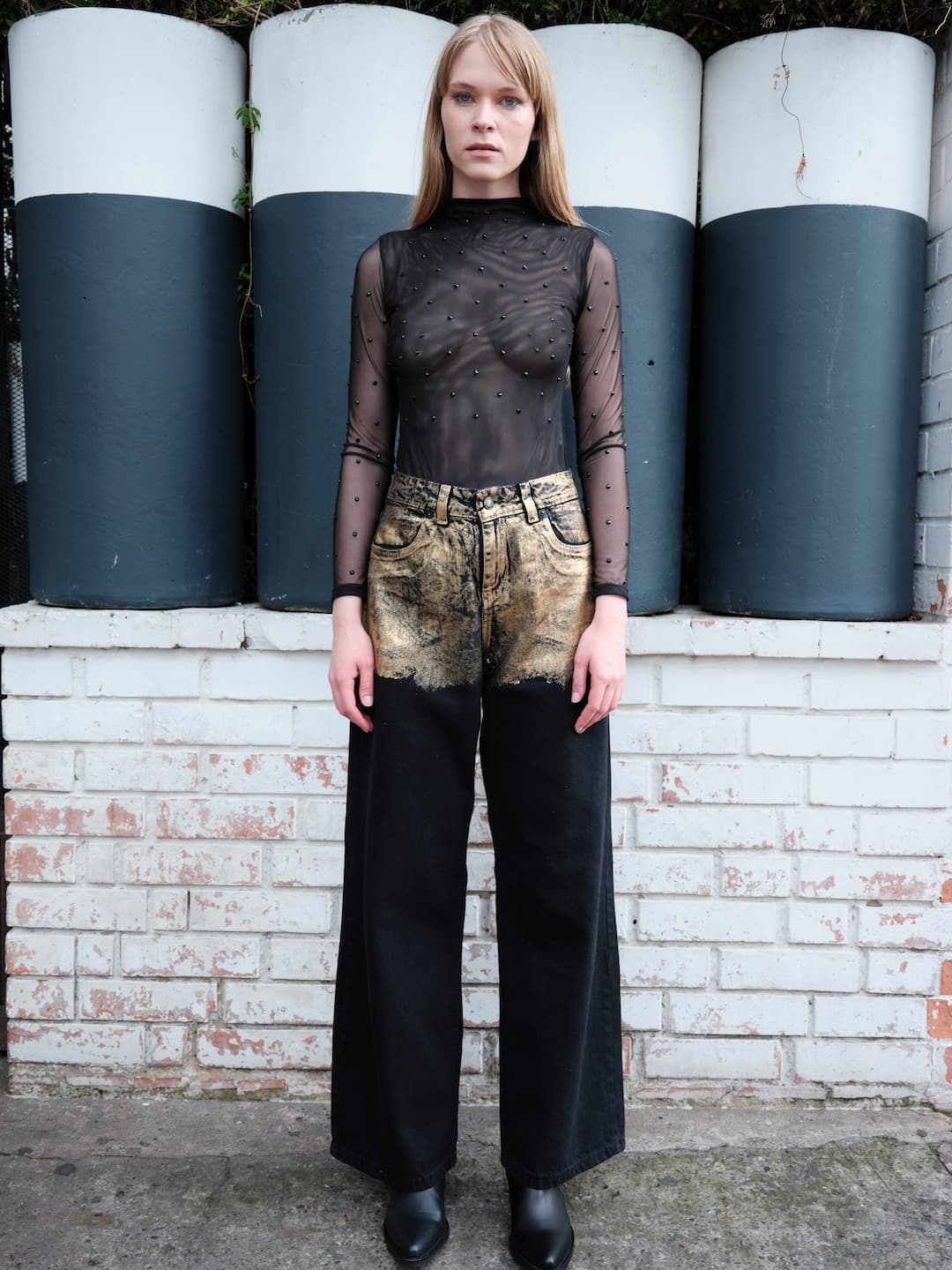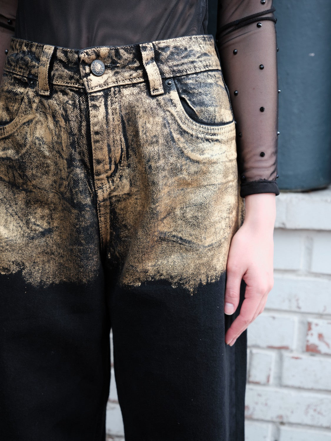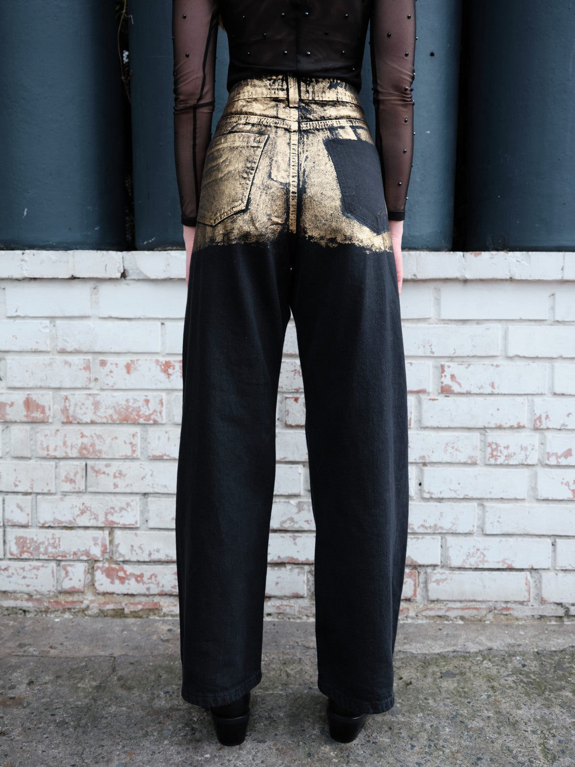 Pantalón metalizado oro y negro. Utiliza un denim negro profundo como lienzo. La aplicación metalizada en tono oro envejecido se concentra en la parte superior, creando un efecto de "baño de metal" que se corta de forma horizontal y orgánica hacia los muslos. Corte "wide leg" de pierna ancha que favorece una caída recta y estructurada