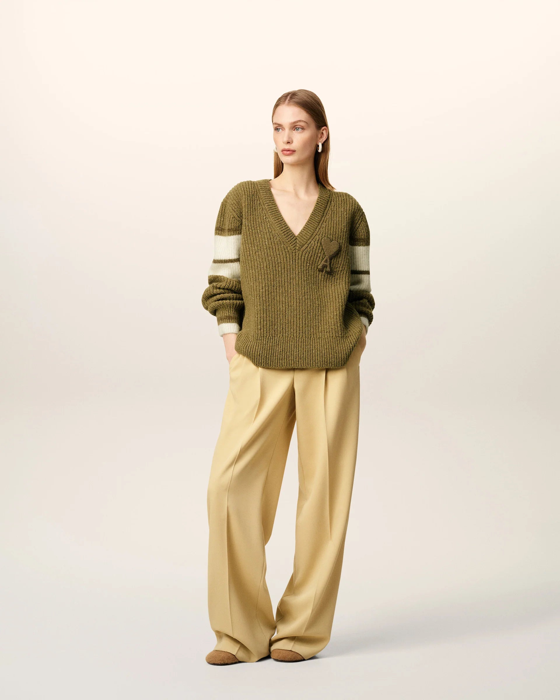 Jersey de lana estilo universitario con punto acanalado. Producto unisex. Cuello redondo. Punto de canalé medio inglés. Parche Ami de Coeur bordado en el pecho. Hilo texturizado en mangas, bajo y puños.
