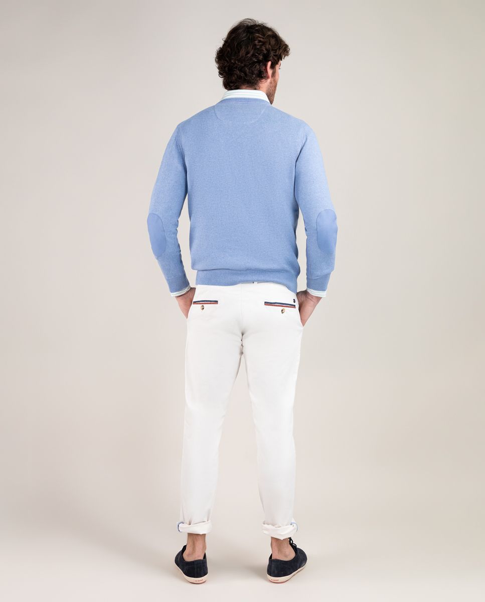Jersey liso de hombre, fabricado en mezcla de algodón y cashmere para conseguir una calidad con mayor suavidad. Corte Regular Fit, cuello de pico y manga larga. Logo bordado en el pecho y coderas de antelina a tono.