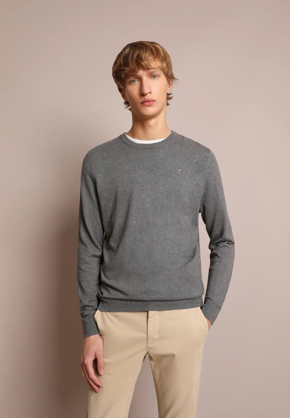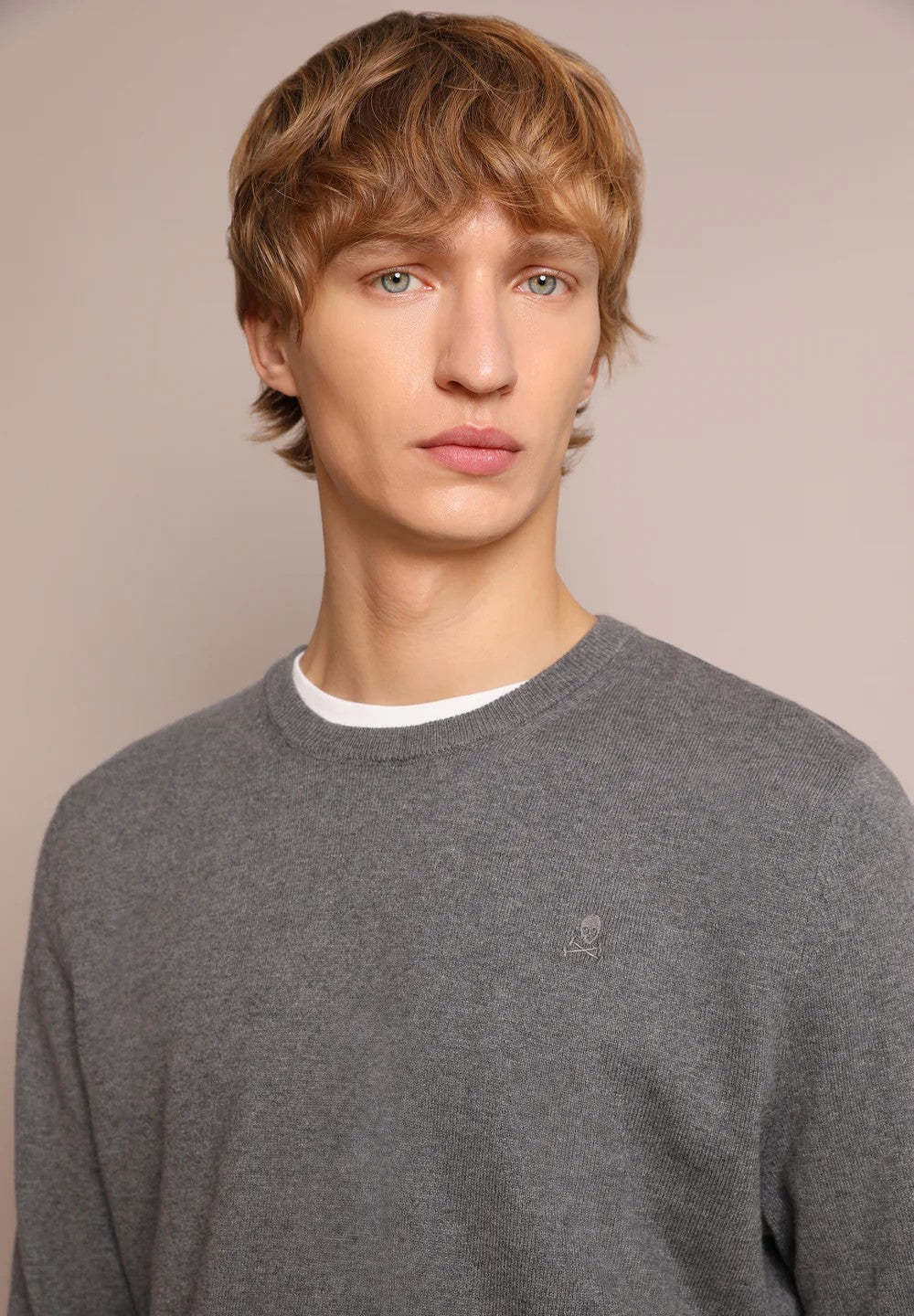 Jersey calavera confeccionado en mezcla de algodón BCI y cashmere. Corte ajustado. Cuello redondo. Manga larga. Detalle de calavera bordada a tono en el pecho.