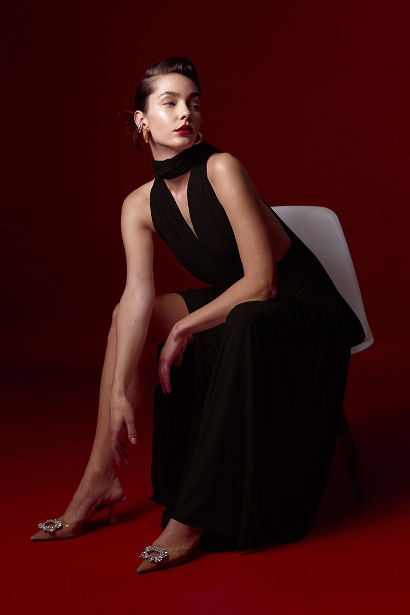 Vestido largo en negro con escote profundo y drapeado envolvente que define la cintura. Su diseño fluido y espalda descubierta aportan movimiento y sensualidad sutil. Una pieza etérea y sofisticada, ideal para ocasiones especiales donde la elegancia se siente sin esfuerzo.