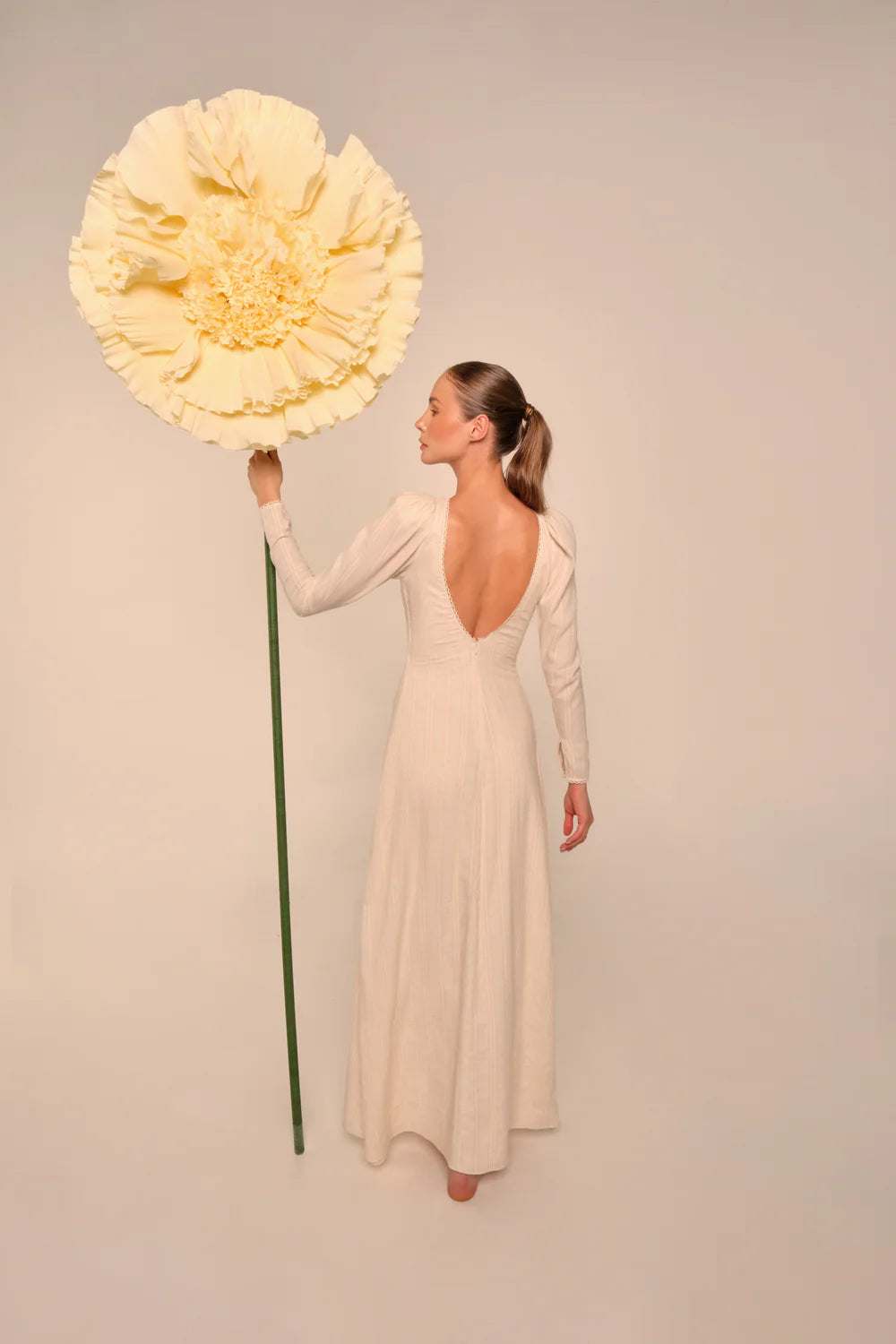 Un vestido romántico hasta los tobillos, confeccionado en 100 % algodón ligero. El escote frontal impecable, los hombros ligeramente fruncidos y las mangas largas crean una línea elegante y femenina, mientras que la espalda en U profunda, con un delicado ribete, le da un acabado especial e inolvidable. Diseño versátil: llévalo con sandalias planas para un look cómodo a diario o realza tu look con tacones y joyas para un momento más formal.