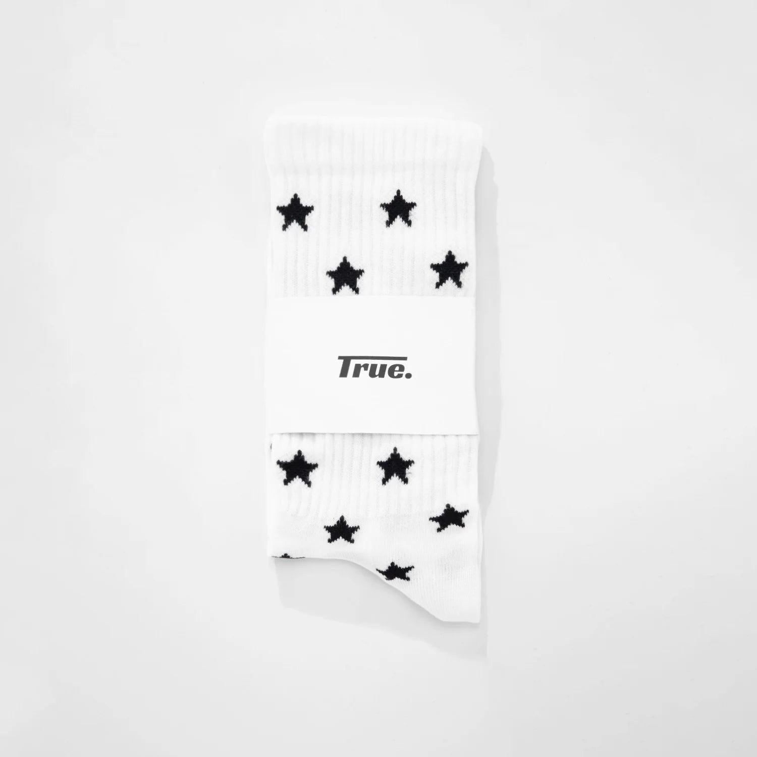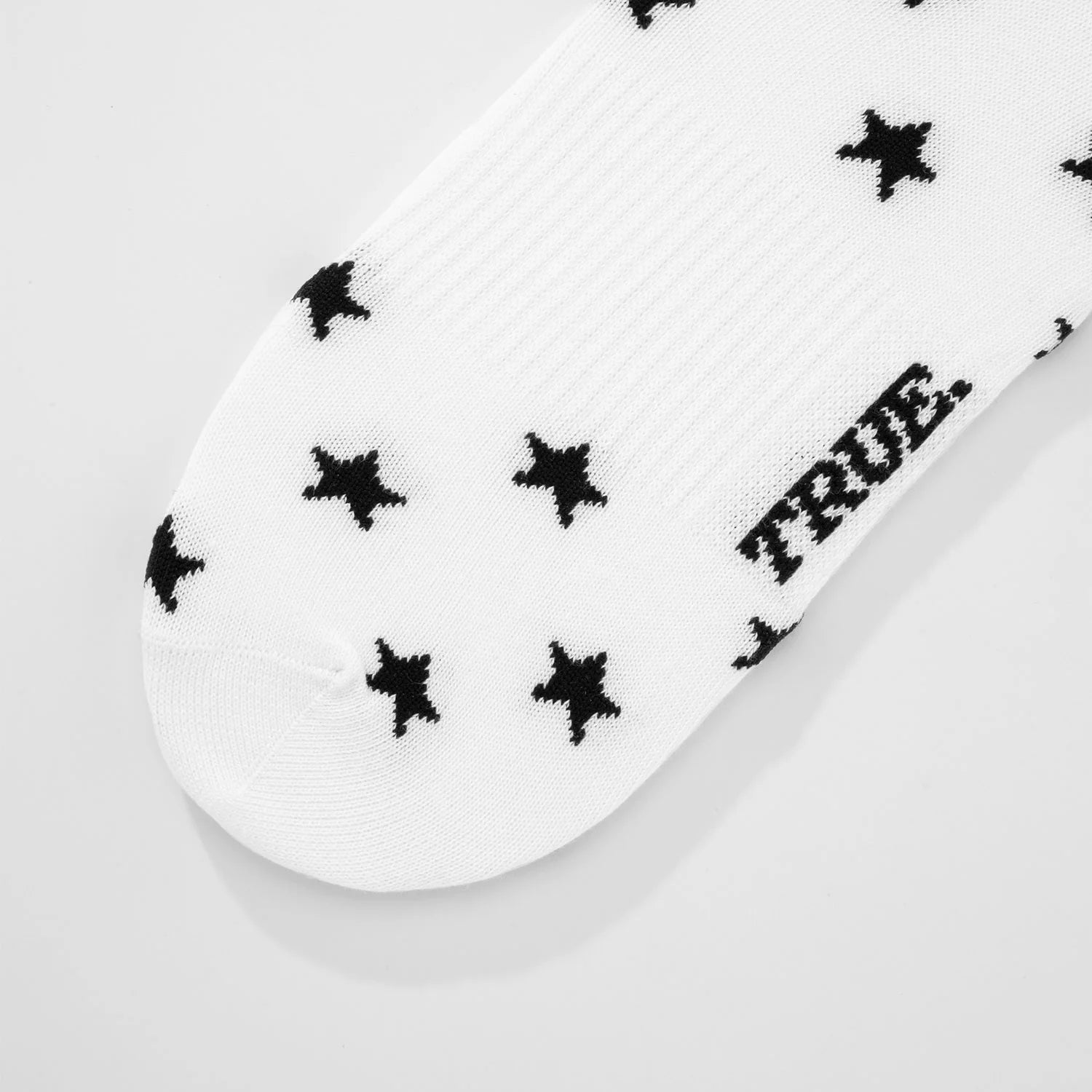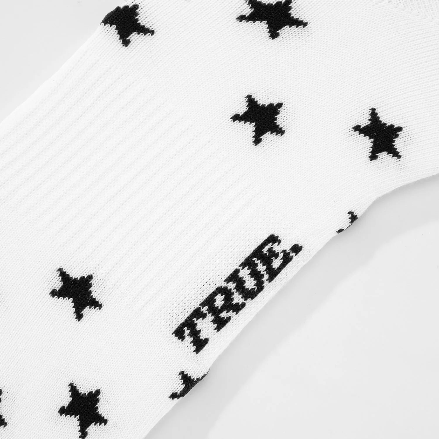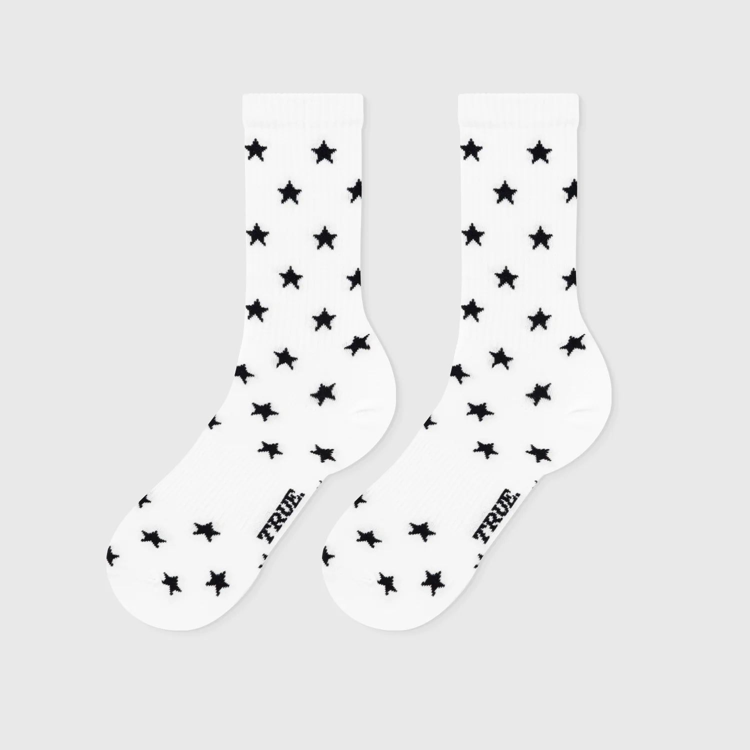Calcetines blancos con logo en la suela y diseño de estrellas negras por toda la prenda.