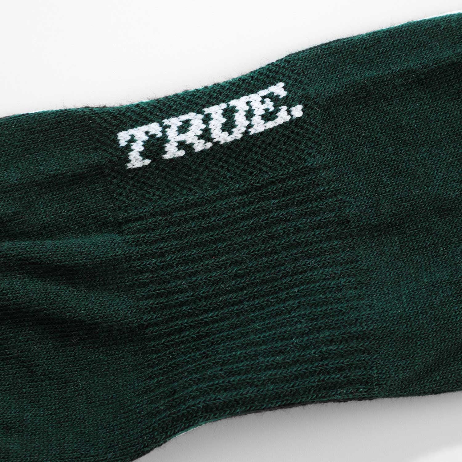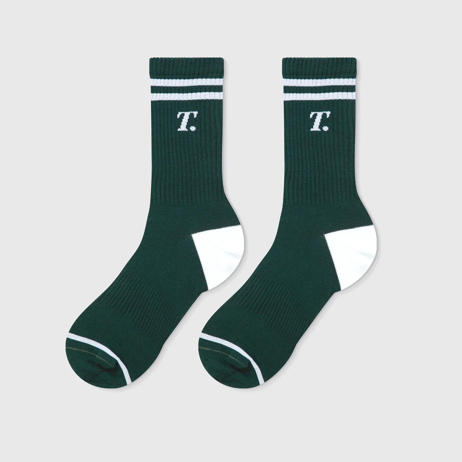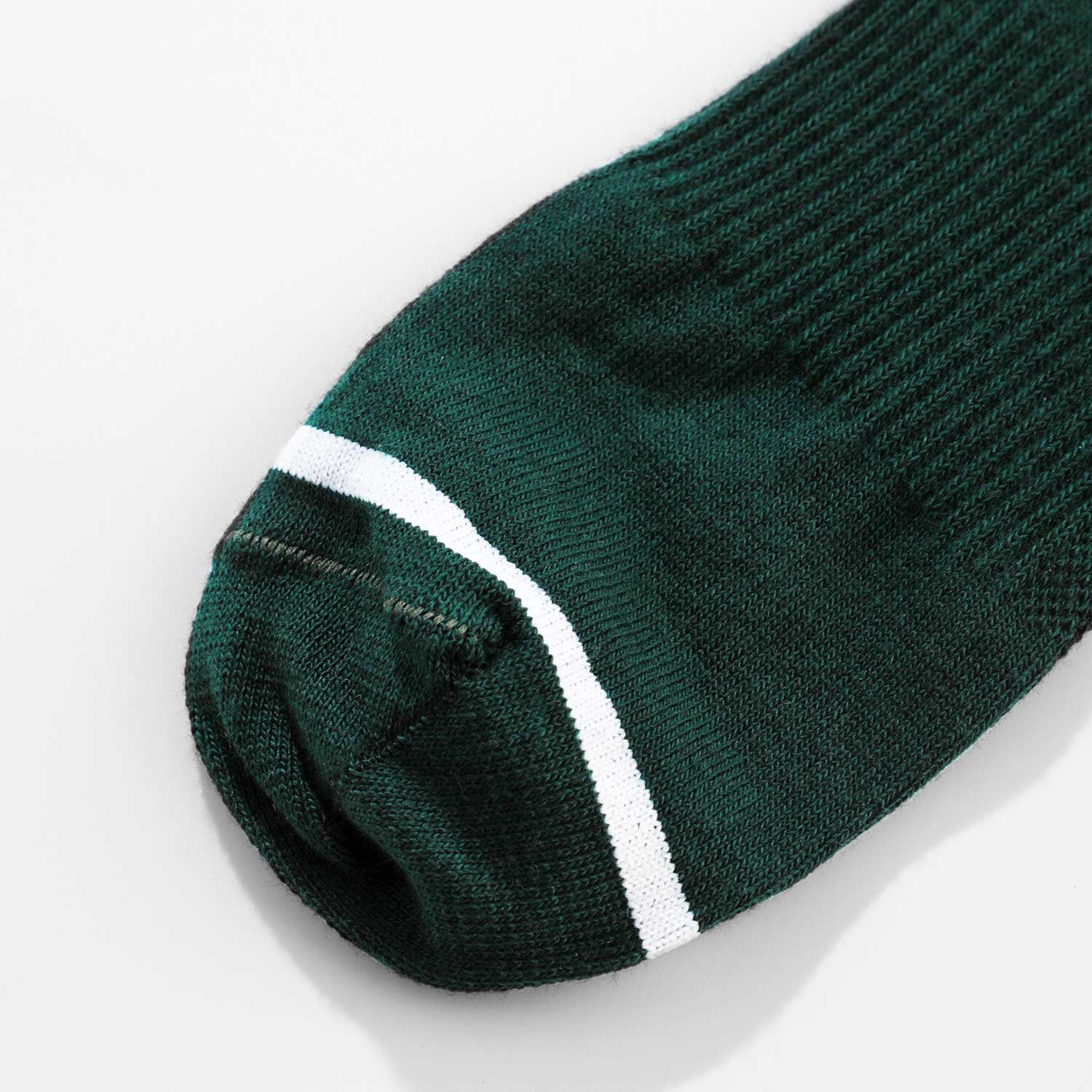 Calcetines verde pino con talón color crema. Llevan el logo en la suela y rayas horizontales en la parte superior.