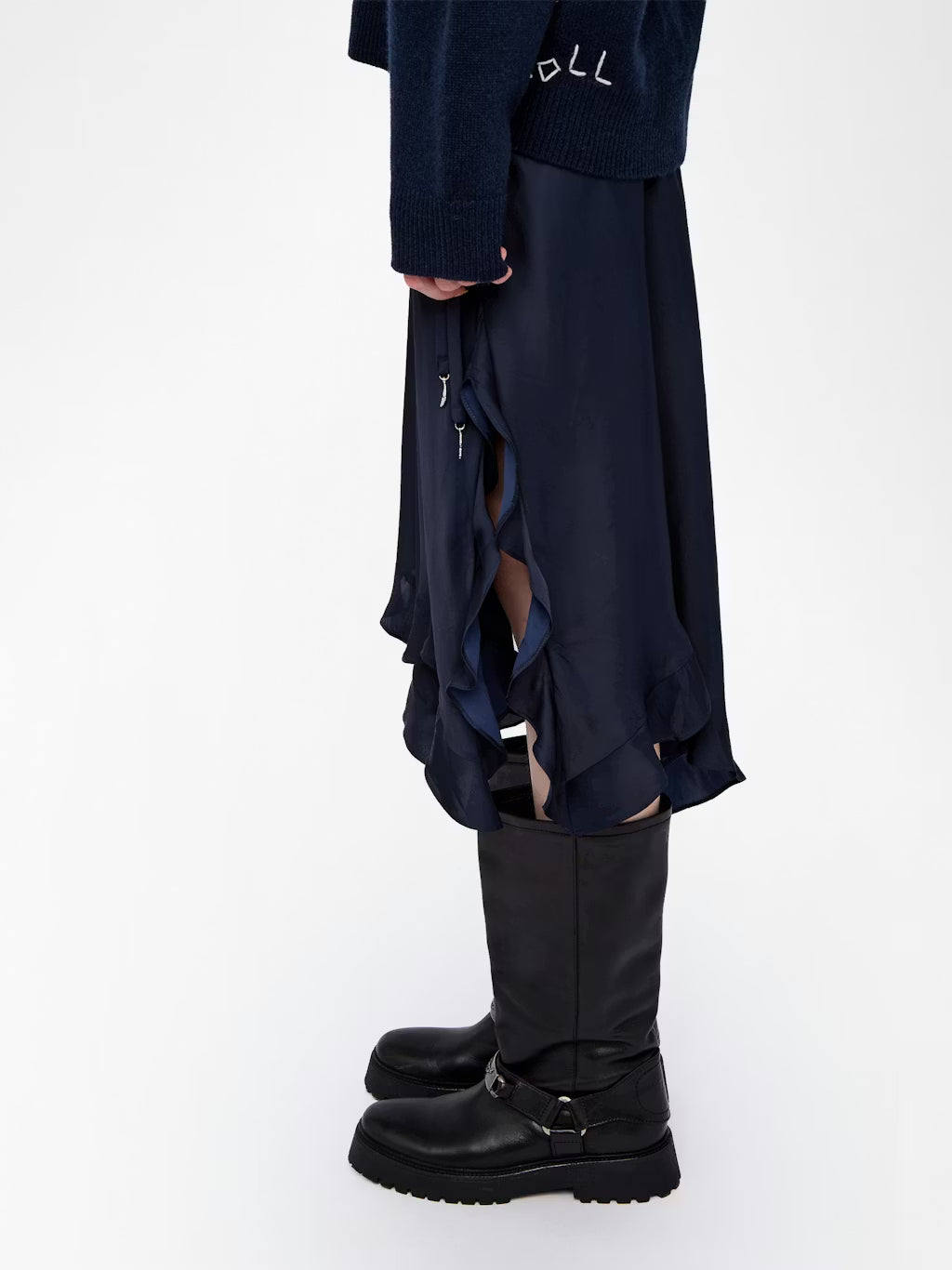 Falda larga asimétrica en satén japonés, con charms de alas en cordón de cintura.