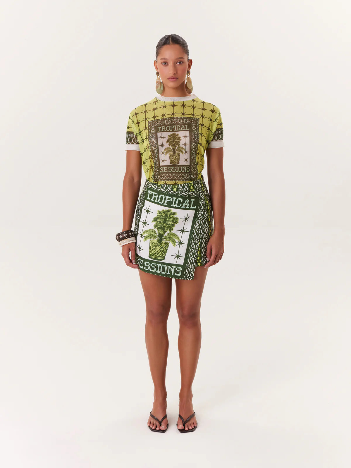 Falda de cintura alta con diseño cruzado y cierre de botones.