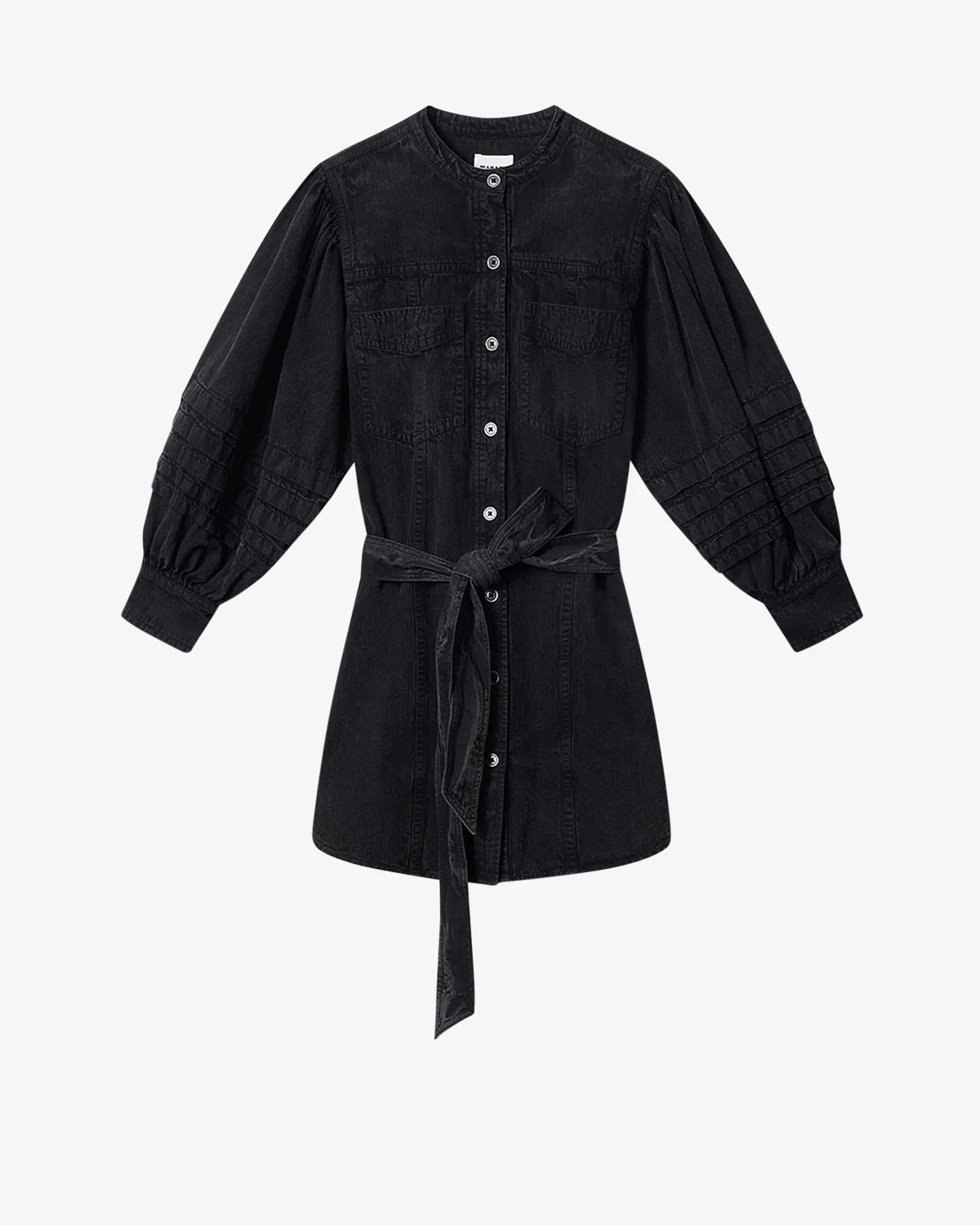 Vestido camisero de algodón ligero de cambray lavado. Escote redondo. Manga larga con juego de pintucks y puños con botones. Cierre de botones. Bolsillos de parche en el pecho. Trabillas en la cintura con cinturón desmontable para anudar. Bajo redondeado y corte recto.