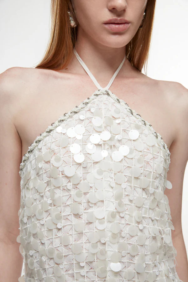 Reviva el romance del verano con el minivestido Marina, de silueta fluida de algodón y detalles bordados a mano. Su rica mezcla de encaje se realza con flores artesanales que le aportan un toque romántico y femenino. Presenta un favorecedor escote en V tanto en la parte delantera como en la trasera, junto con una sutil transparencia. Completa el look con sandalias minimalistas y un clutch para una noche elegante.