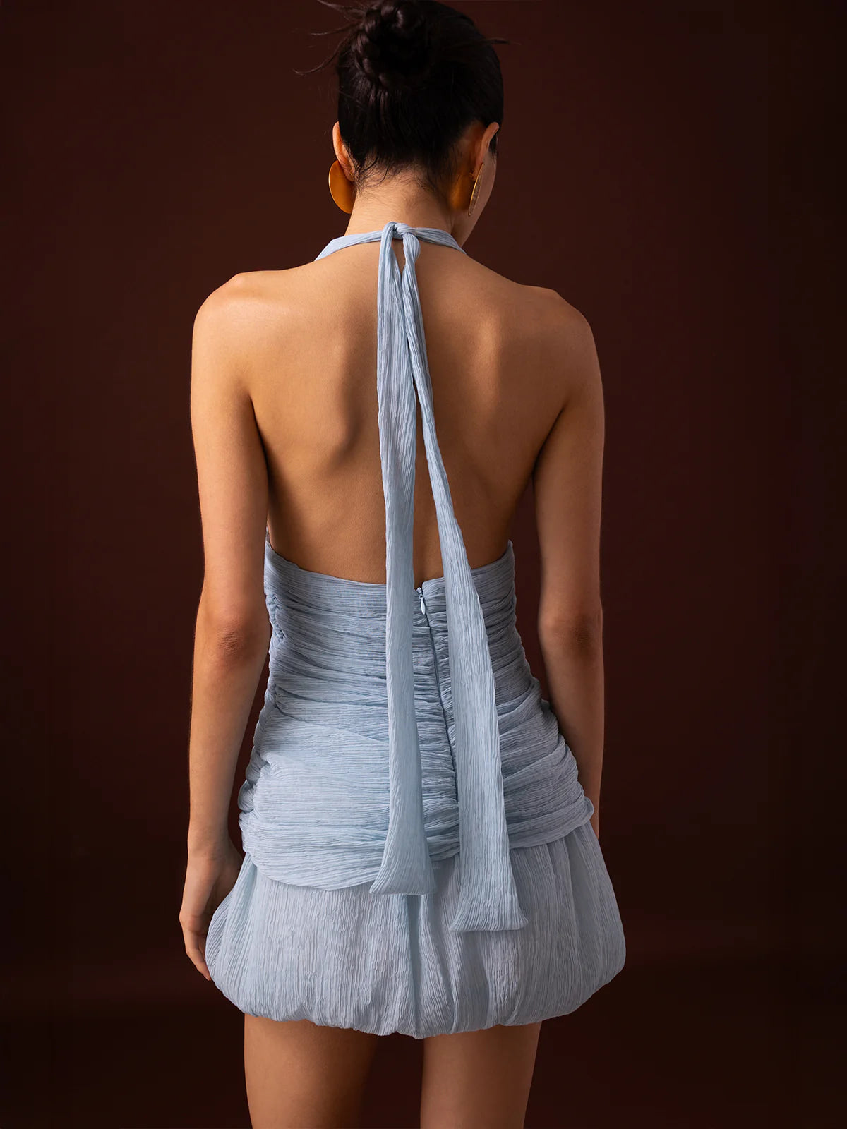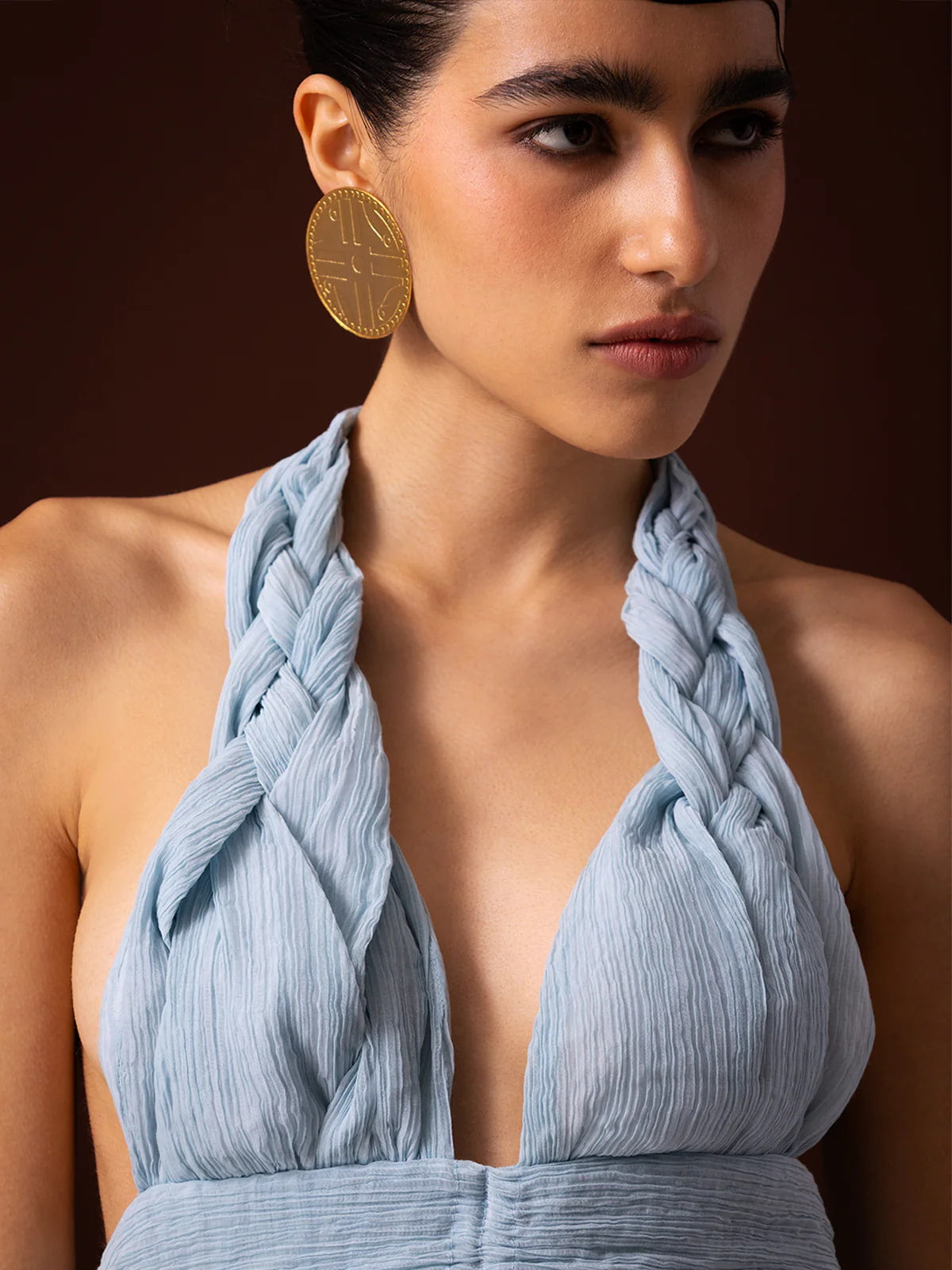 The Niebla dress, una armonía entre delicadeza y crudeza. Confeccionado en una tela plisada, ligera como una pluma, que le da un aspecto suave y etéreo. En el busto, lleva trenzas crudas que aportan una textura táctil, un guiño al trabajo rústico con cuerdas y los amarres utilitarios de las tradiciones campesinas.
