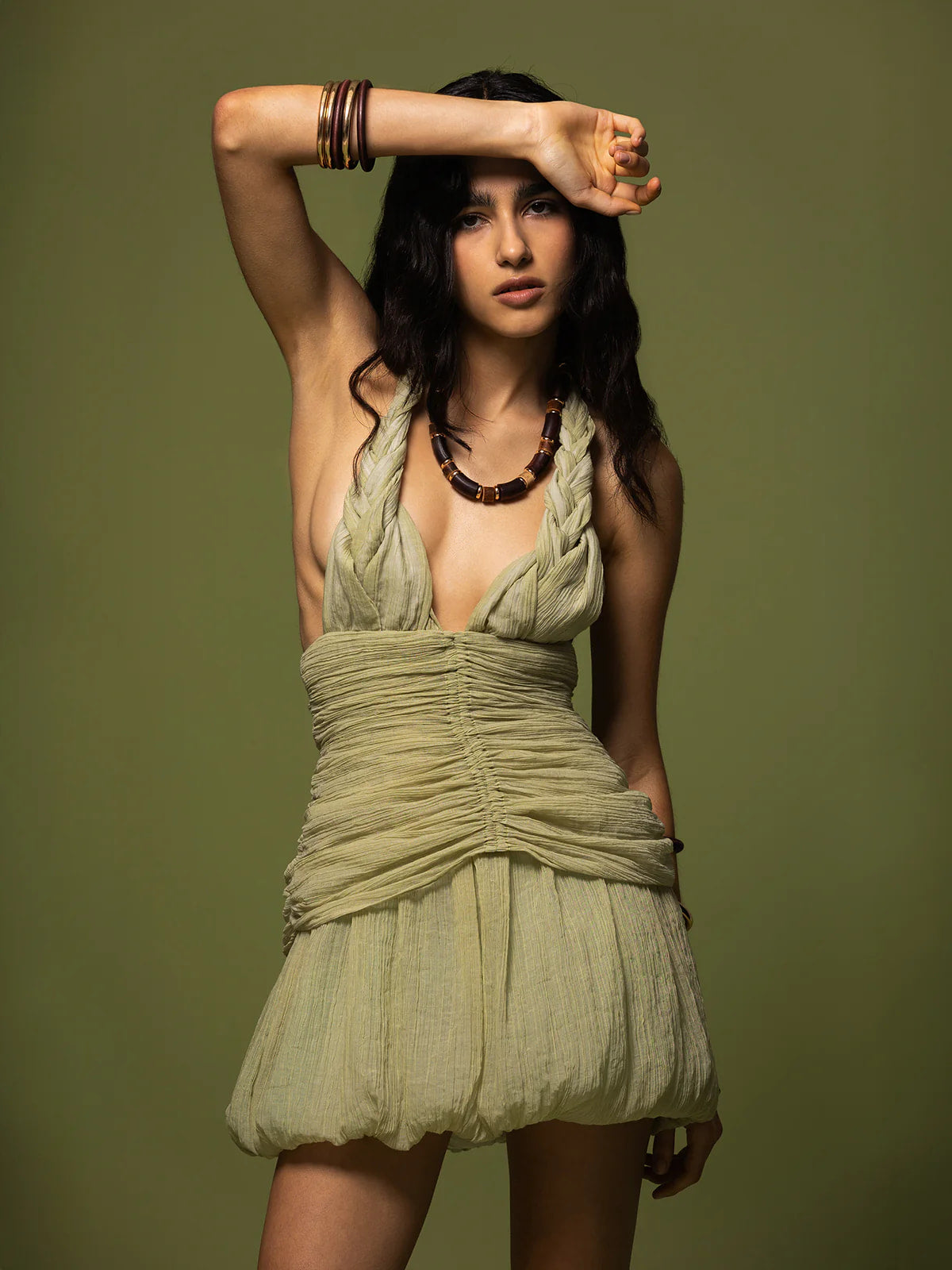 The Niebla dress, una armonía entre delicadeza y crudeza. Confeccionado en una tela plisada, ligera como una pluma, que le da un aspecto suave y etéreo. En el busto, lleva trenzas crudas que aportan una textura táctil, un guiño al trabajo rústico con cuerdas y los amarres utilitarios de las tradiciones campesinas.