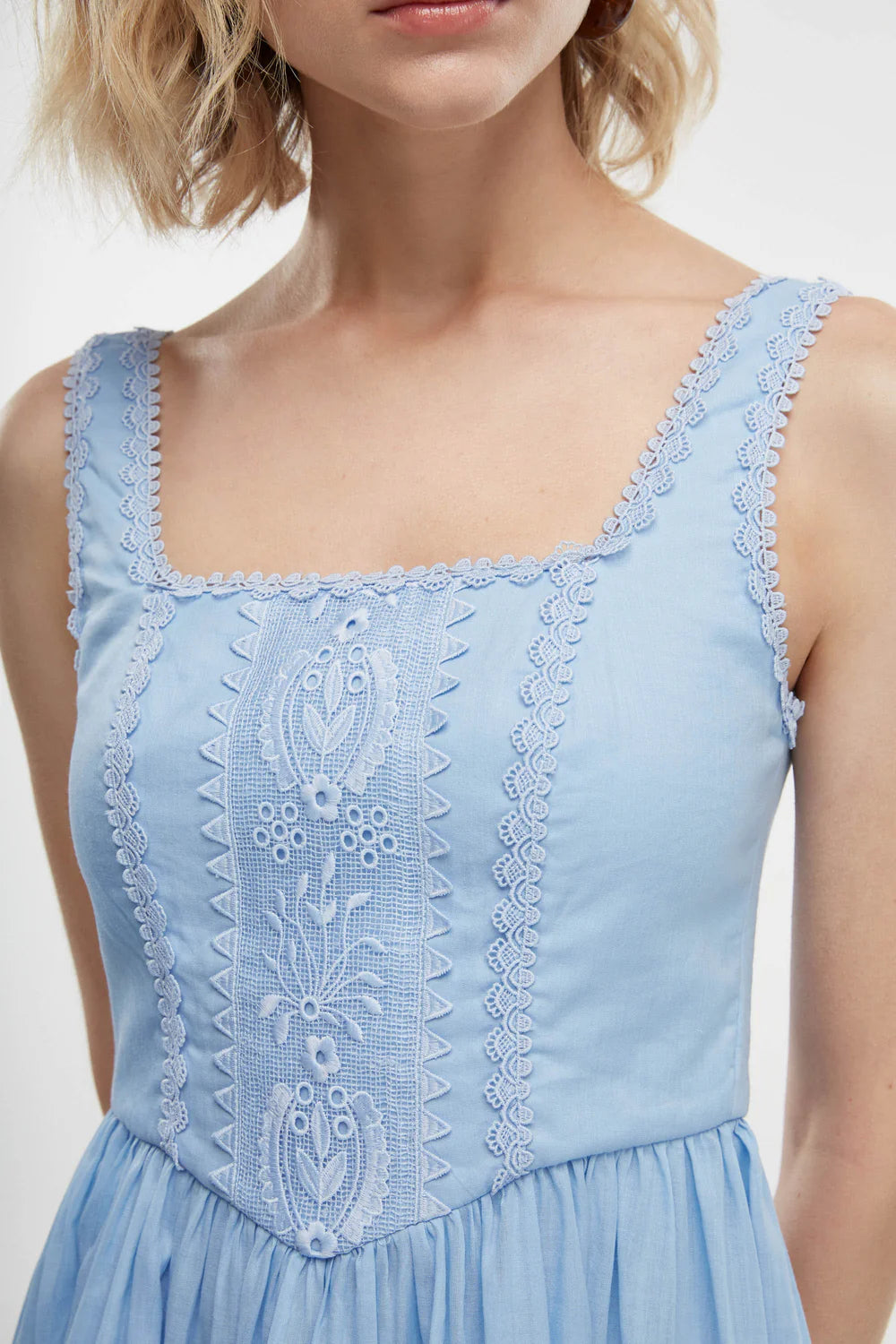 El minivestido Serena es una prenda corta y de corte holgado que celebra la sencillez con un diseño fresco y juvenil. El escote cuadrado y los tirantes finos le confieren una delicada estructura, mientras que la falda amplia con detalles bordados añade un toque artesanal que realza la prenda.