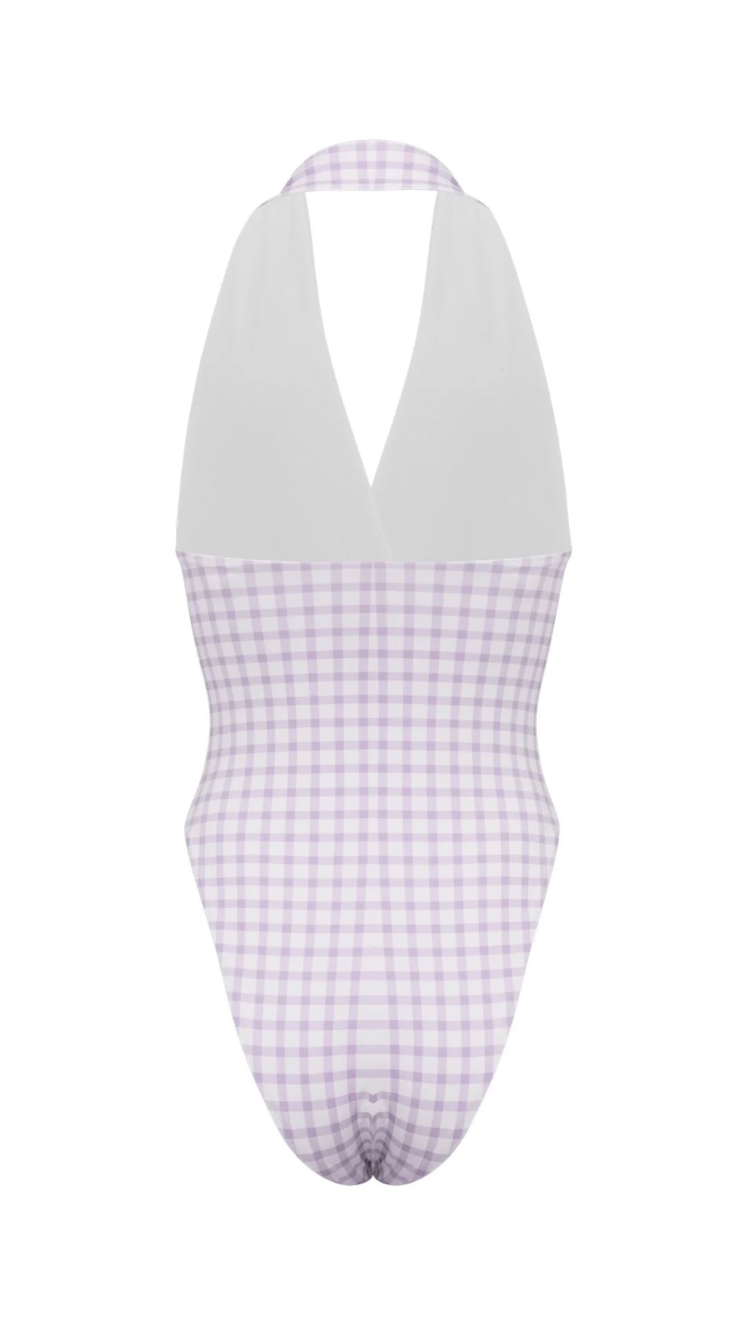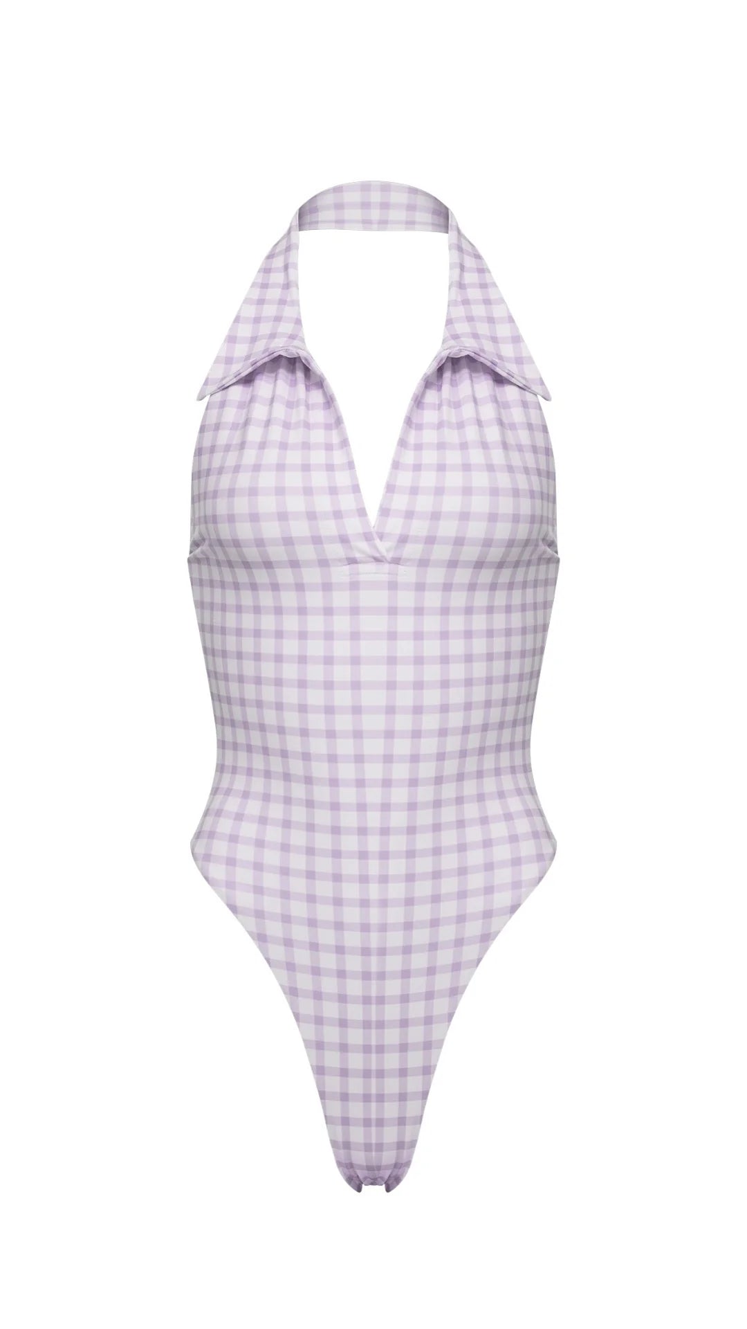 Enterizo con cuello estilo polo con una abertura en la parte frontal. El corte es ajustado al cuerpo, resaltando la silueta, y tiene un diseño de pierna alta.